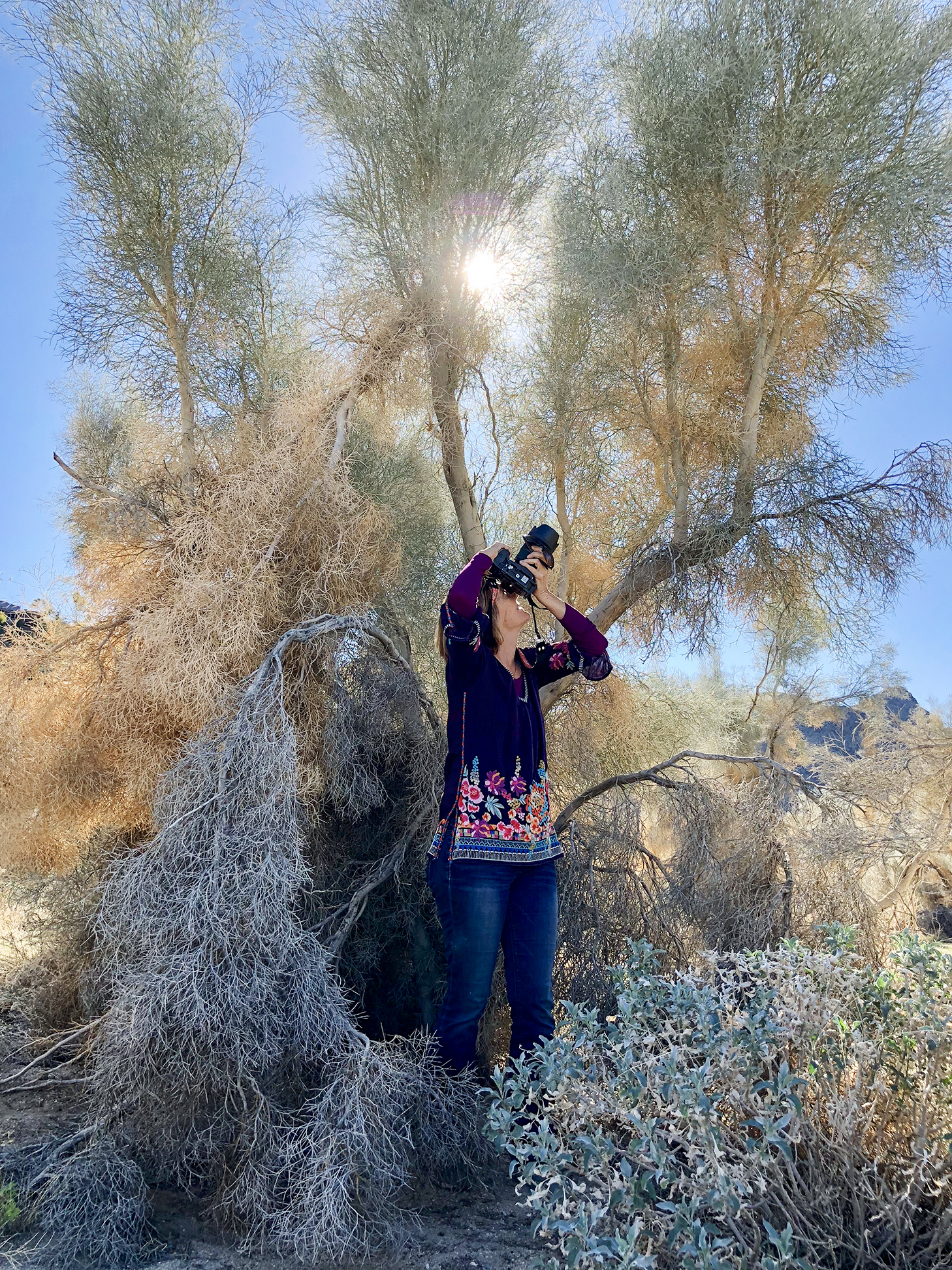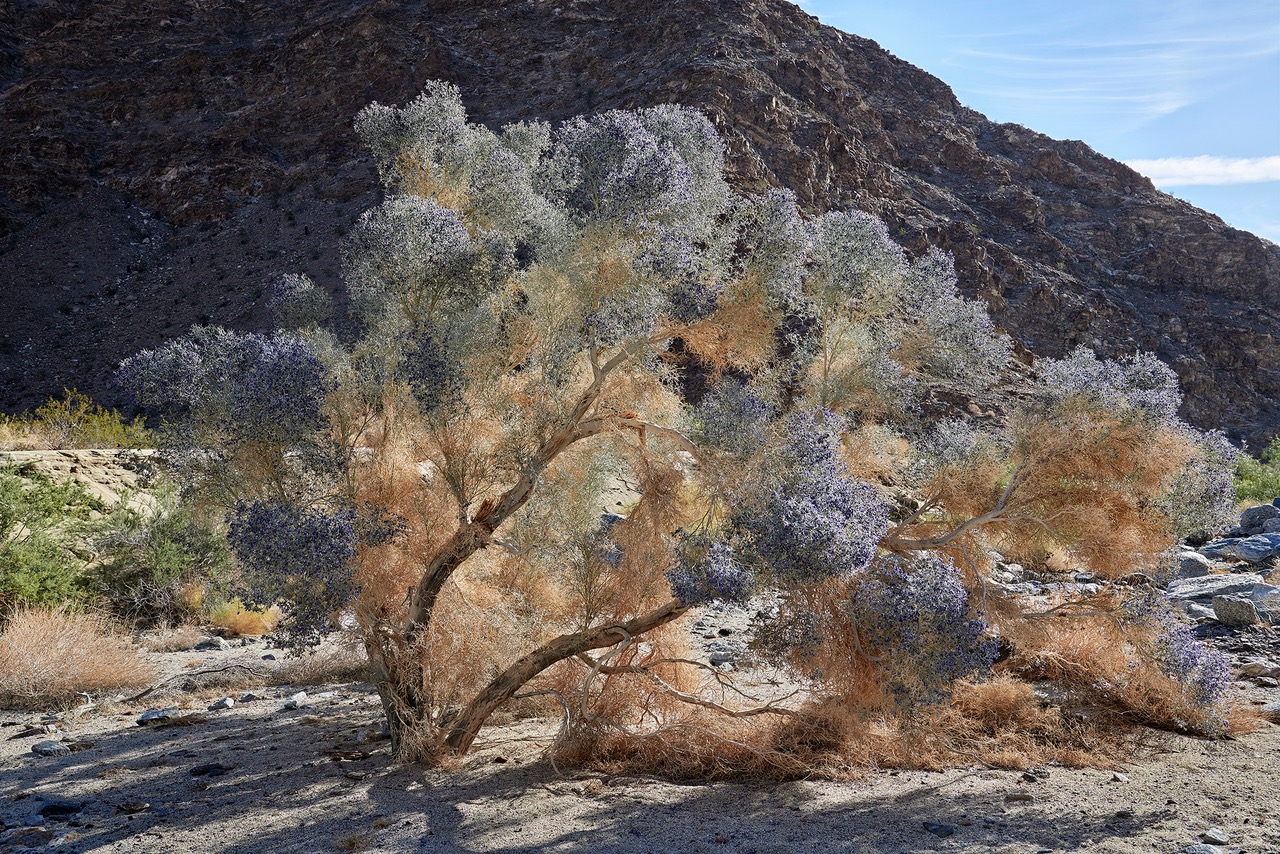 In comparison to Terry’s long tenure in the desert, Millicent Harvey is a more recent arrival from Boston. An award-winning commercial and fine art photographer known for her landscape architecture work, she embraced the tree the first time she drove down Highway 111 and glimpsed the silvery heads in Araby Wash. She is a study in constancy. After traveling on assignments to photograph glamorous estates in Sonoma and New Haven, she always comes back to her wash.
