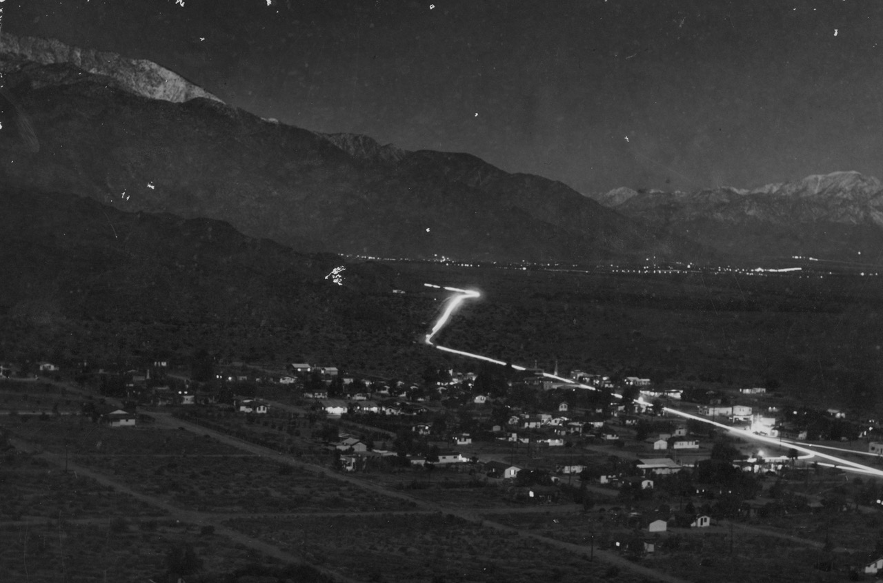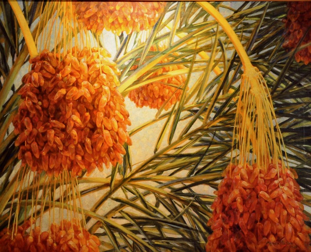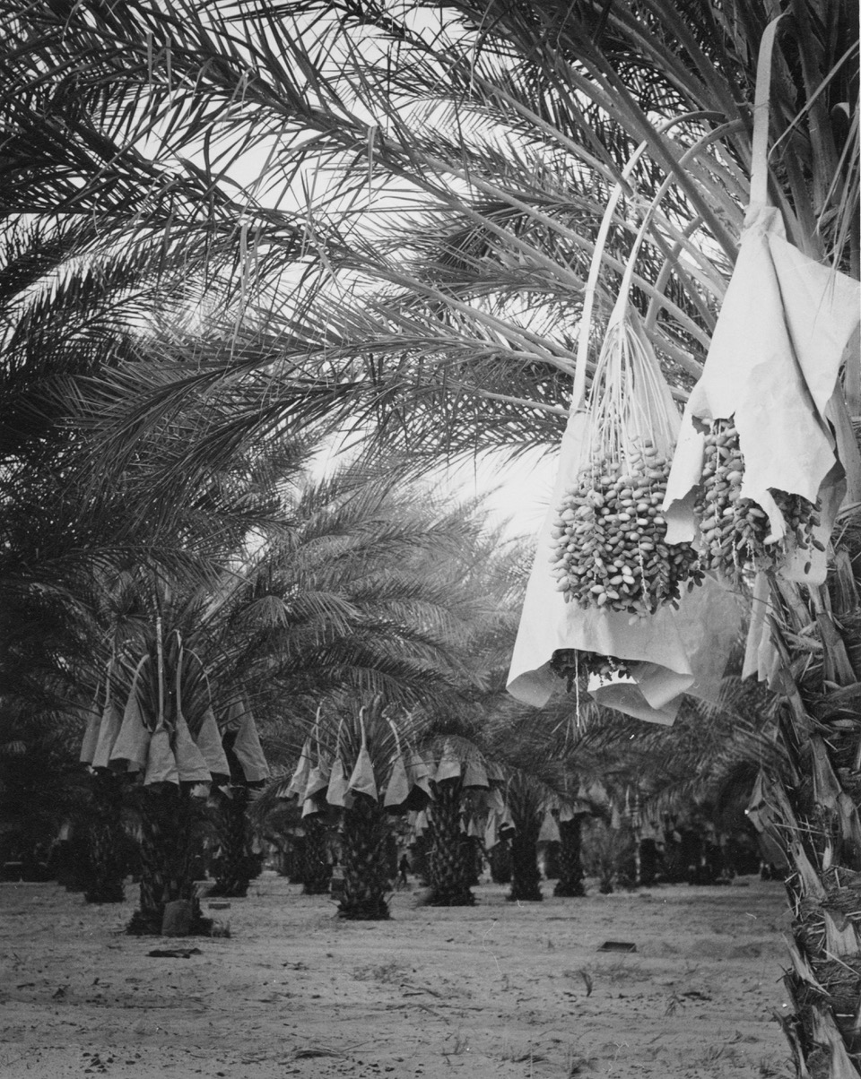 (October 12, 1936) This is a drowsy day — I am working on some pictures for the opening of the Gallery in Palm Springs. A very large one of dates among other things…It is still hot daytimes — rather charming in a way, if my neighborhood was more relaxed, but an orgy of building is going on, little houses springing up everywhere — new children, new dogs, new radios! Twilight is filled with a human medley — and I reluctantly watch new strips of the dear desert being torn up by the tractor, and smell new piles of lumber — watching beside doomed cactus bushes….