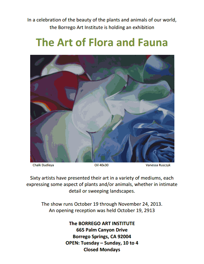The Borrego Art Institute is poised to be a major player in California art. Their first exhibit this season, Flora and Fauna, runs through November 24, 2013.