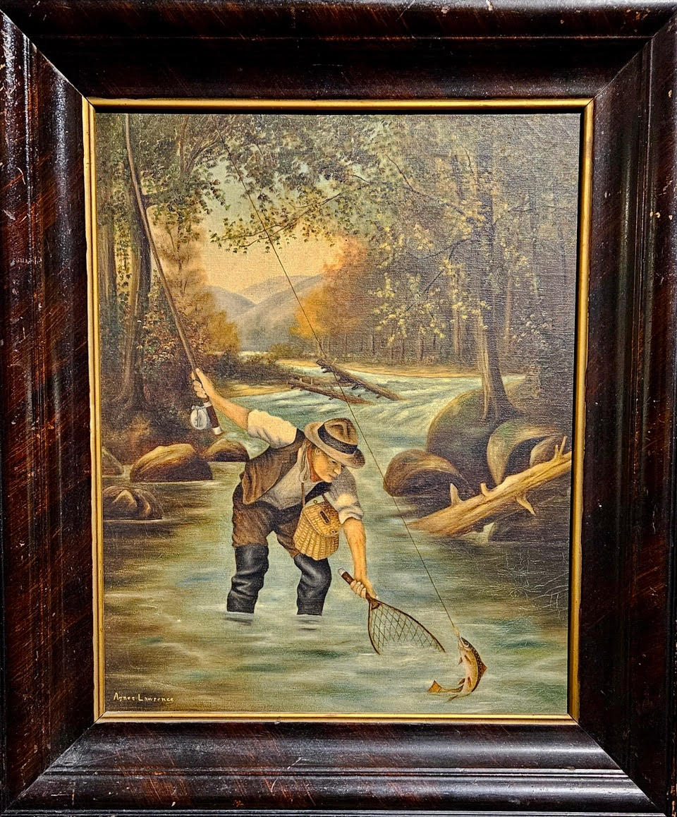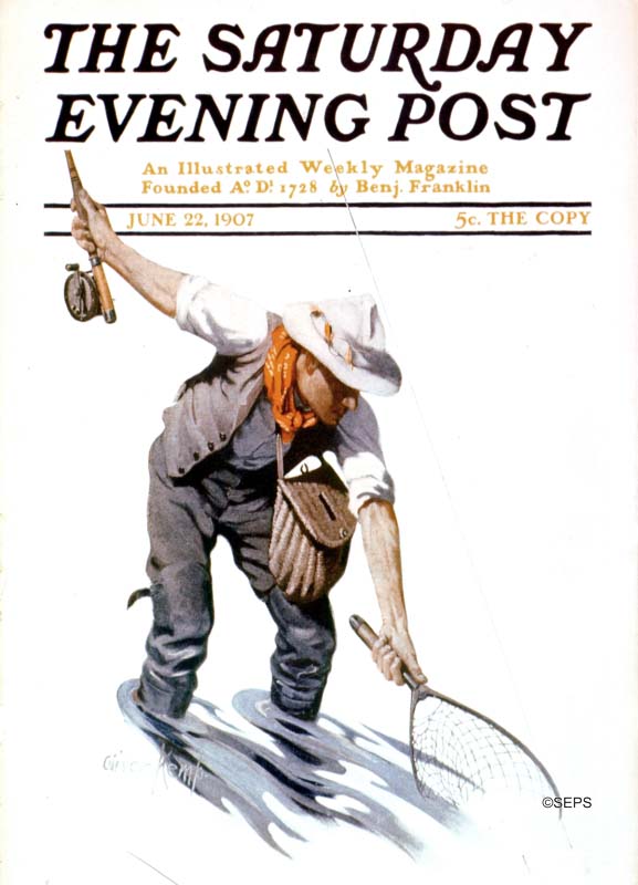 With help from Tom himself (a Wisconsin-based collector of sporting art) and the art dealer and Pelton expert Michael Kelley—along with a weigh-in by Pelton relative Nyna Dolby–I can now say: I was wrong. Agnes likely painted the fisherman in the stream. What’s more, she likely copied an earlier painting by Oliver Kemp, and Oliver himself borrowed from an even earlier 1862 lithograph by AF Tait. A version of the Kemp painting appeared on the cover of the Saturday Evening Post in June, 1907.