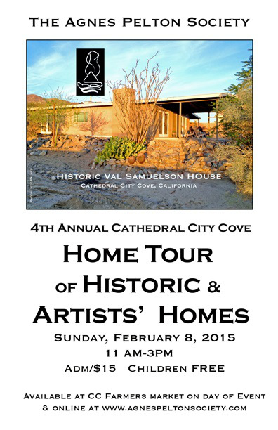 On Sunday, Feb 8, 2015, from 11-3 pm, The Agnes Pelton Society is hosting a tour of artists’ homes and historic pads. This is your chance to visit Pelton’s former home and studio. See the original diamond-scored concrete floors she trod, along with an impressive collection of early desert paintings amassed by owners Peter Palladino and Simeon Den. There are abundant riches to be found on this tour, including the historic Val Samuelson house (owned by photographer and early Cove resident Jeff Palmer), the studios of desert artists Ray Lanowy and Jessica Schiffman, the historic adobe of artist Gary Borgstedt, and the historic home of Willard Price, a journalist and world-traveler who was a close friend of Agnes Pelton.