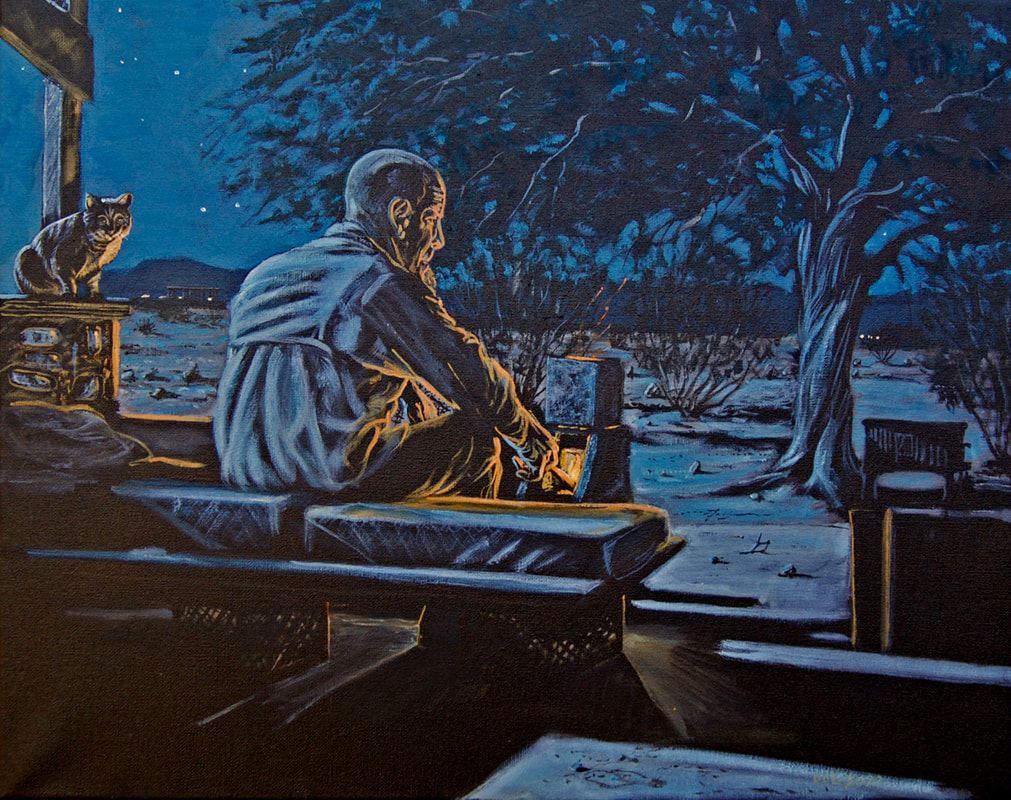 Known for his nighttime landscapes of the Joshua Tree desert, Greene has made big leaps in his new work, on view at the 29 Palms Art Gallery in October, 2020. His latest Mojave Noir show is subtitled: A Decade In the Dark. A major new triptych to be unveiled is a tribute to his mentor, James Beoddy, of Columbus, Ohio–Greene’s home turf.