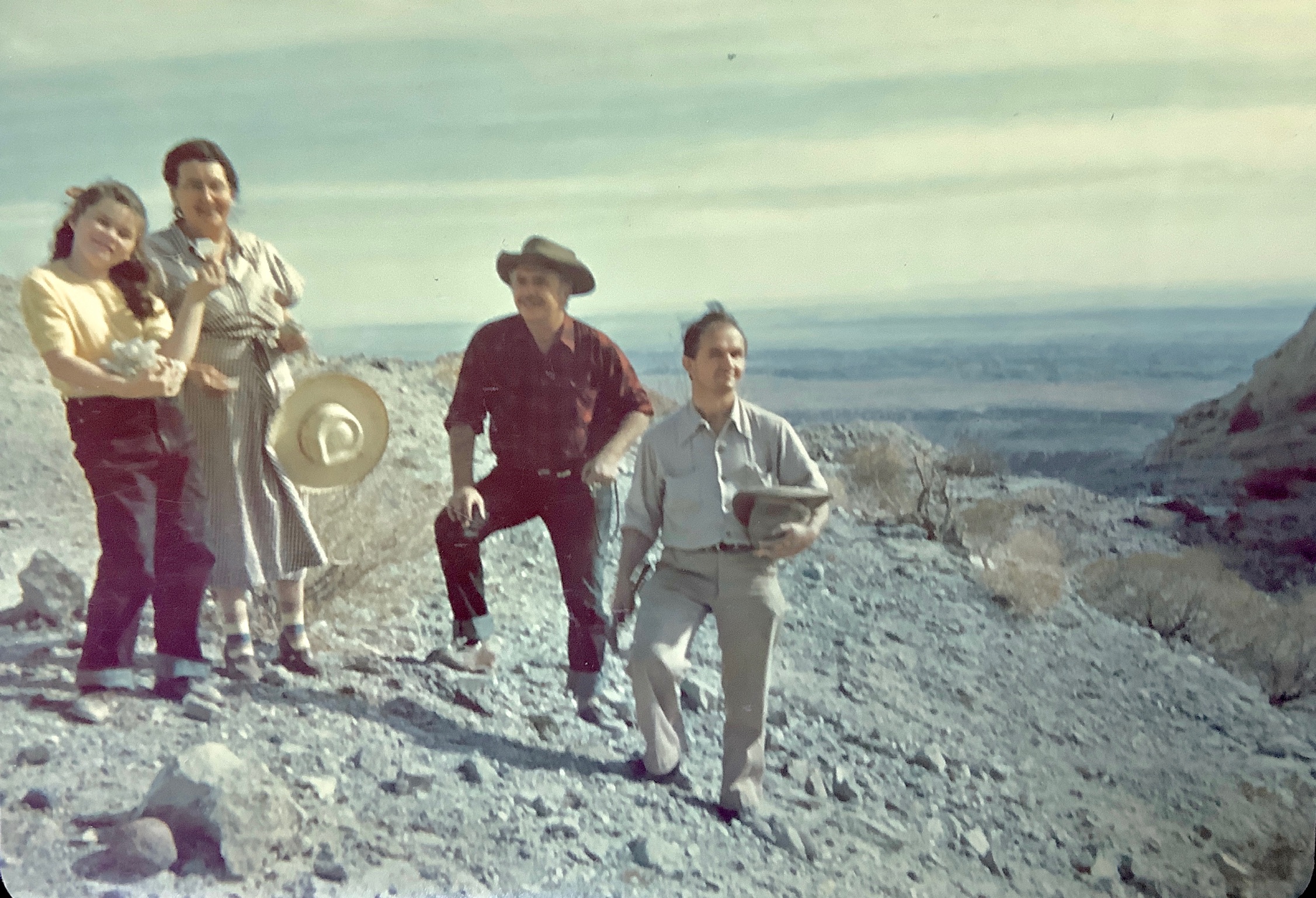 Herman Clarke, at right with John Hilton in hat. Kathi Hilton is the girl holding a chunk of calcite, 1950.