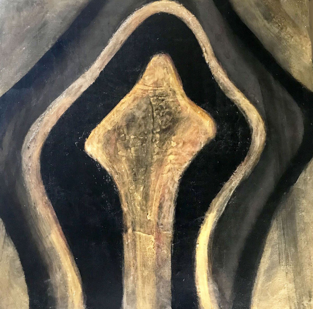 Juliette Vos is back in the Netherlands where she lives most of the year, but as always she spent the springtime in Palm Springs. The riveting work here, Theotokos, started as a “grizzly bear ghost painting” but then morphed into the Virgin Mary (Theotokos are religious icons of Mary.) “I have reimagined the Virgin and the grizzly ghost together as one, lit by candle light and shimmering in gold,” Voss says.