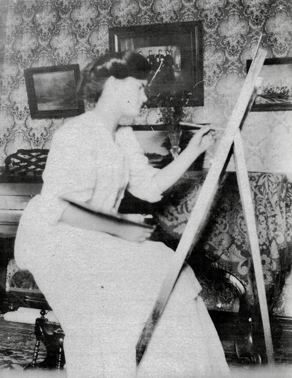 After the original Sheckler homestead was swept away in a flood, the clan built a new house in 1929. The house where Caroline still lives was built from the timbers of an old honey barn. Since Hazel’s death at age 94 in 1981, her photos and negatives and a few paintings have been stashed in the house. Caroline took some batches down to the drugstore and had the tiny antique negatives enlarged. Some of the artwork in the house was stolen. She never locked the door until recently.