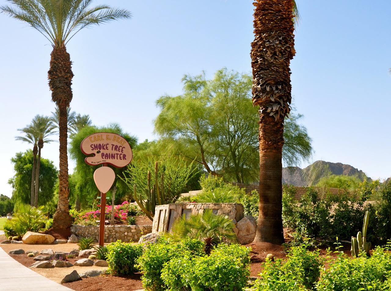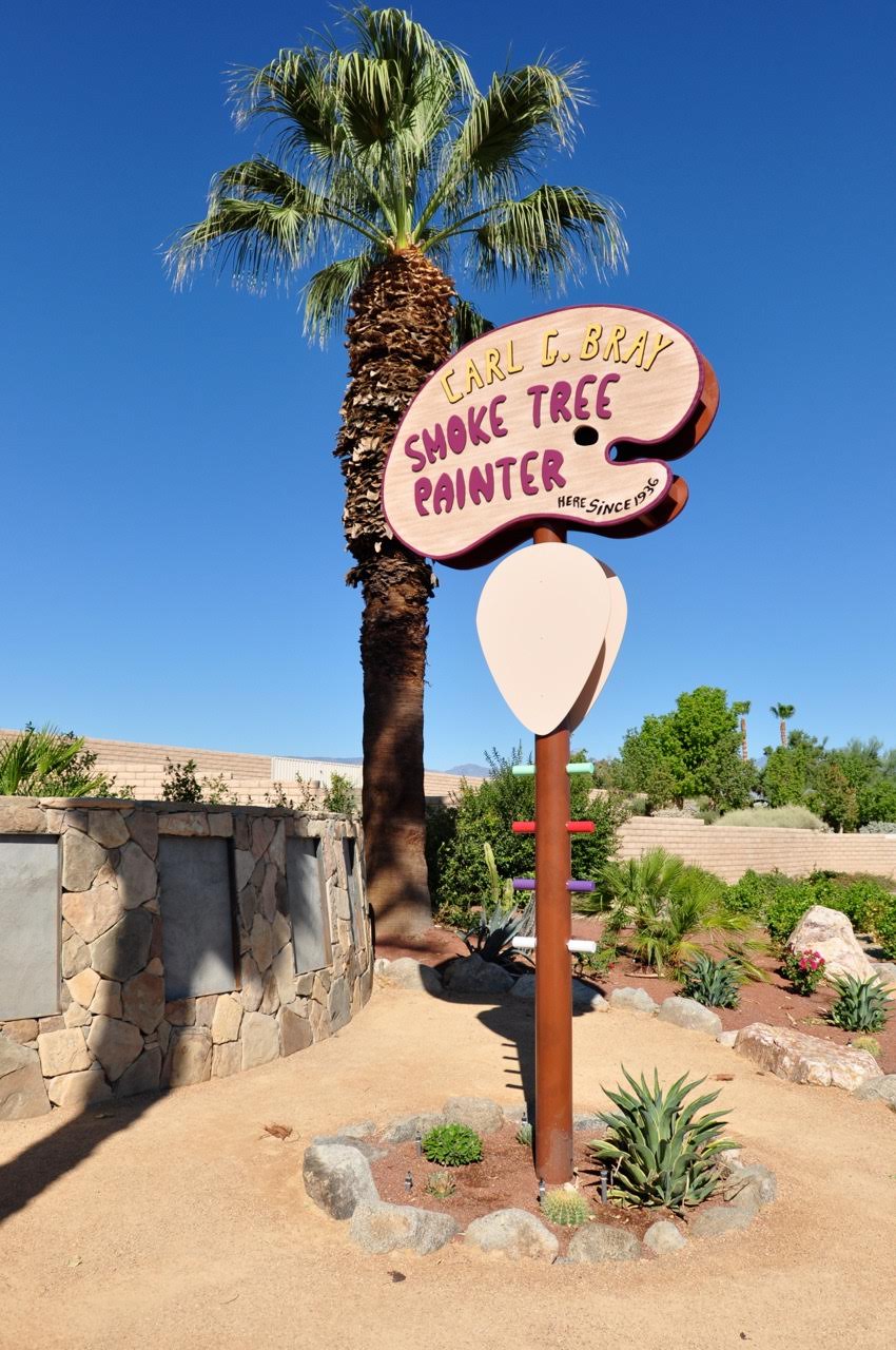 The resurrection of the palette-shaped Smoke Tree Painter sign is a testament to the tenacity of the Indian Wells Historic Preservation Foundation. The group, led by Adele Ruxton, kept nudging the City for the last five years to see the project through. Preservationists all over the Valley lobbied to save Carl’s roadside gallery and home when it was threatened with demolition in 2010, but it was ultimately torn down anyway. Carl died in Banning the following year. As part of a mitigation agreement (by law, you have to make amends if you tear down an important place), the City was bound to construct a marker at the site.