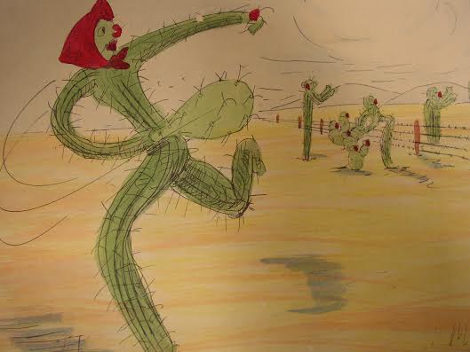 Neal Gray recently came across two intriguing sketches by Villasenor, from a series of 21 cartoon-style illustrations called Cactus Capers. The sketches–Fancy Tennis and Mowing Them Down–are dated 1939. The Cactus Capers series appears to have been linked to a book or magazine project, but the story behind them is lost.