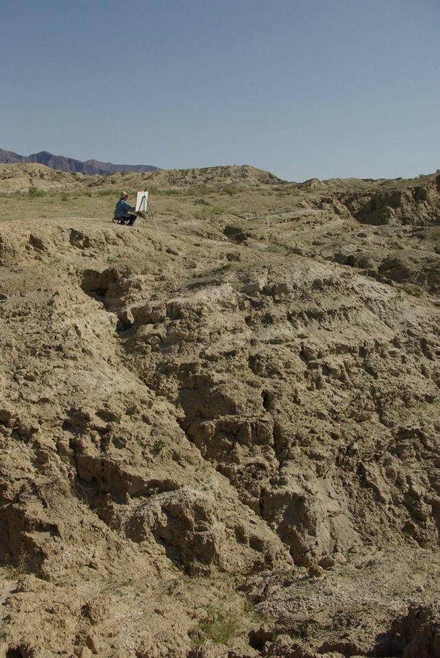 Editor’s note: Many people paint the desert but only a few embody the ur-qualities of the early desert artists. Jane Culp is one. She lives in an off-grid straw bale cabin perched above the Anza-Borrego desert. From this solitary outlook, she observes–and participates in–the natural forces that pulverize granite and push tectonic plates.