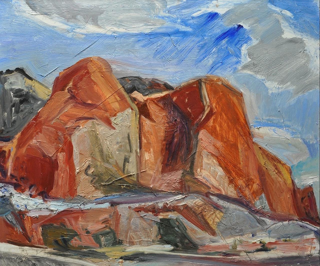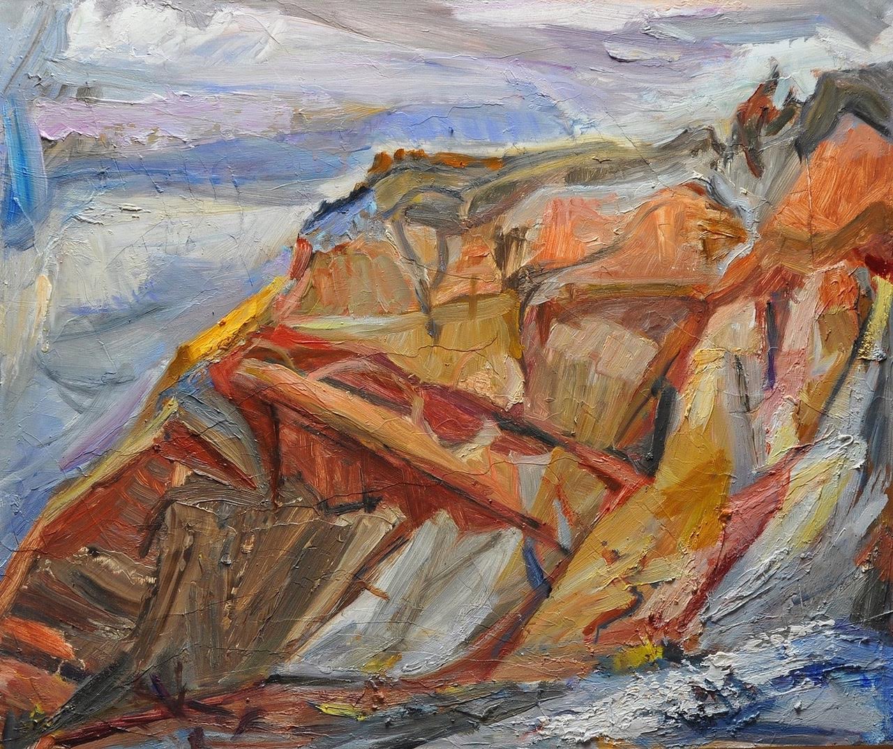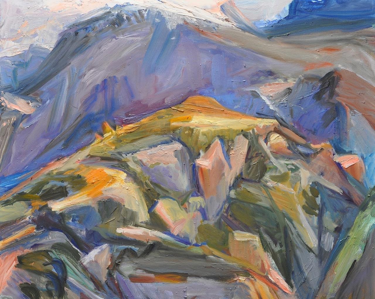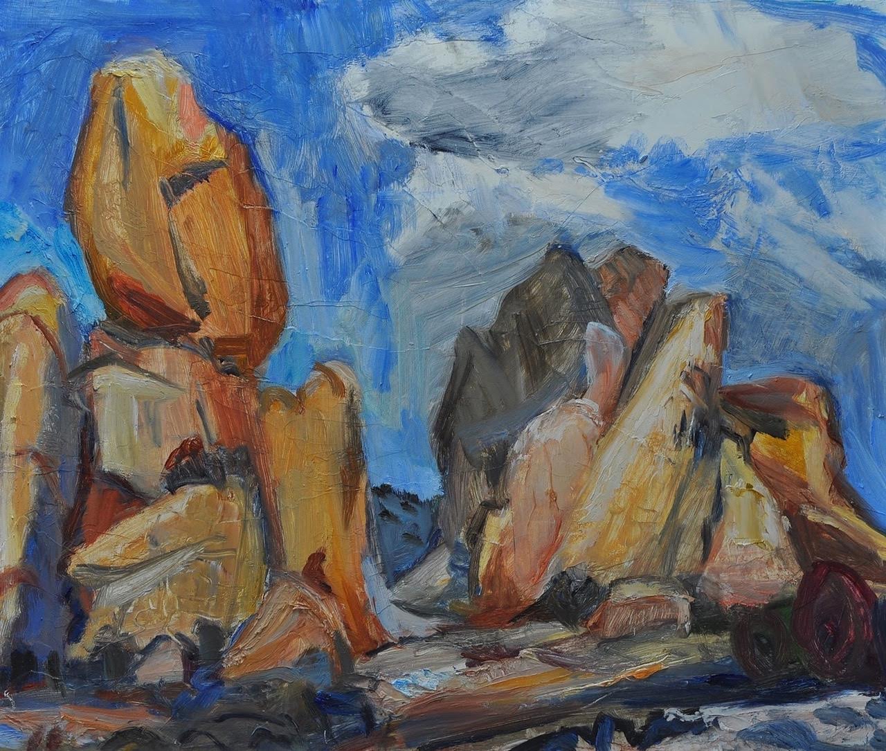 Jane: They have an active history. They were formed by wind, rain, and by tectonics that push up and crack apart as the rain filters through. And so the West is full of young rocks and young land being formed. The East is full of old used up rocks with trees growing over everything and in your face. So I like the West where I can see what has happened to the earth and what is still happening. I’m totally captivated by this. Why? Because it speaks to me. Because I can look at a rock and feel its history in my body. I’m close to the earth, the sky is over me and huge. When painting, my body is very close to the rocks, the landscape is all quite alive.
