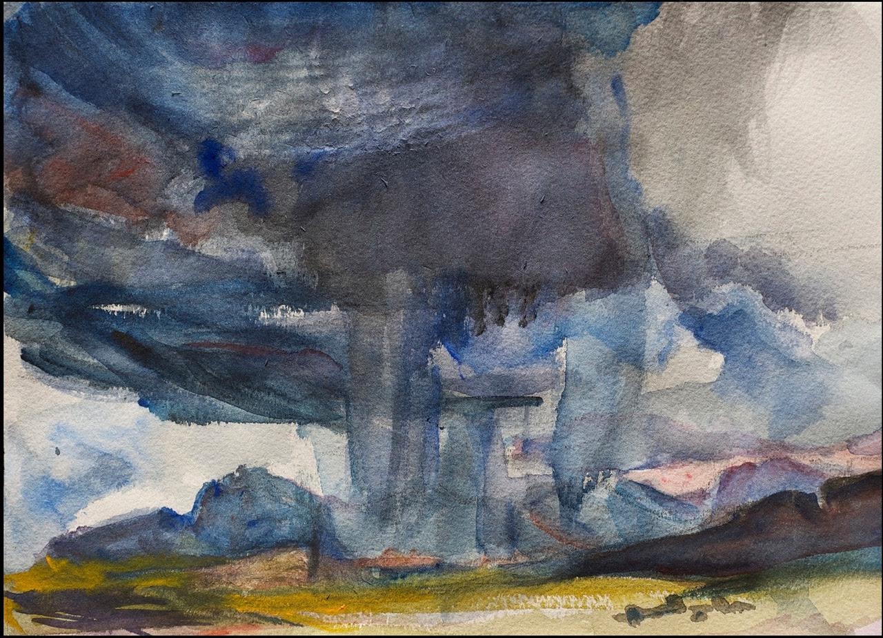 I think the color here has a lot more individuated character, it fits the forms. The attempted greens of the scratchy little brush are sparse, deep dark with orange umber black in them. I like the shape variety of clouds in the always changing big sky. The West has different clouds than back East, the winds tear and pull at them incessantly fighting for their moisture. Those elliptical clouds formed over the Mojave desert are just killers. They are amazing beings. You can see what’s going on in the weather patterns out here so much easier than back East. Nothing is buried. It’s all obvious. I can’t spend time trying to find where the bottom of a tree comes because there’s a bush in front of me. I don’t want to, and I’m not sure I even want them to overlap. I just want to see the nature of the beast in front of me, the nature of the creature, the nature of the mountain, the tree, the rock, whatever it is. I’m not interested in static patterning and design, instead I’m curious about uncodified irregularity. So it has to be a natural order for me to spin the story. I can’t paint intuitively without movement and natural order.