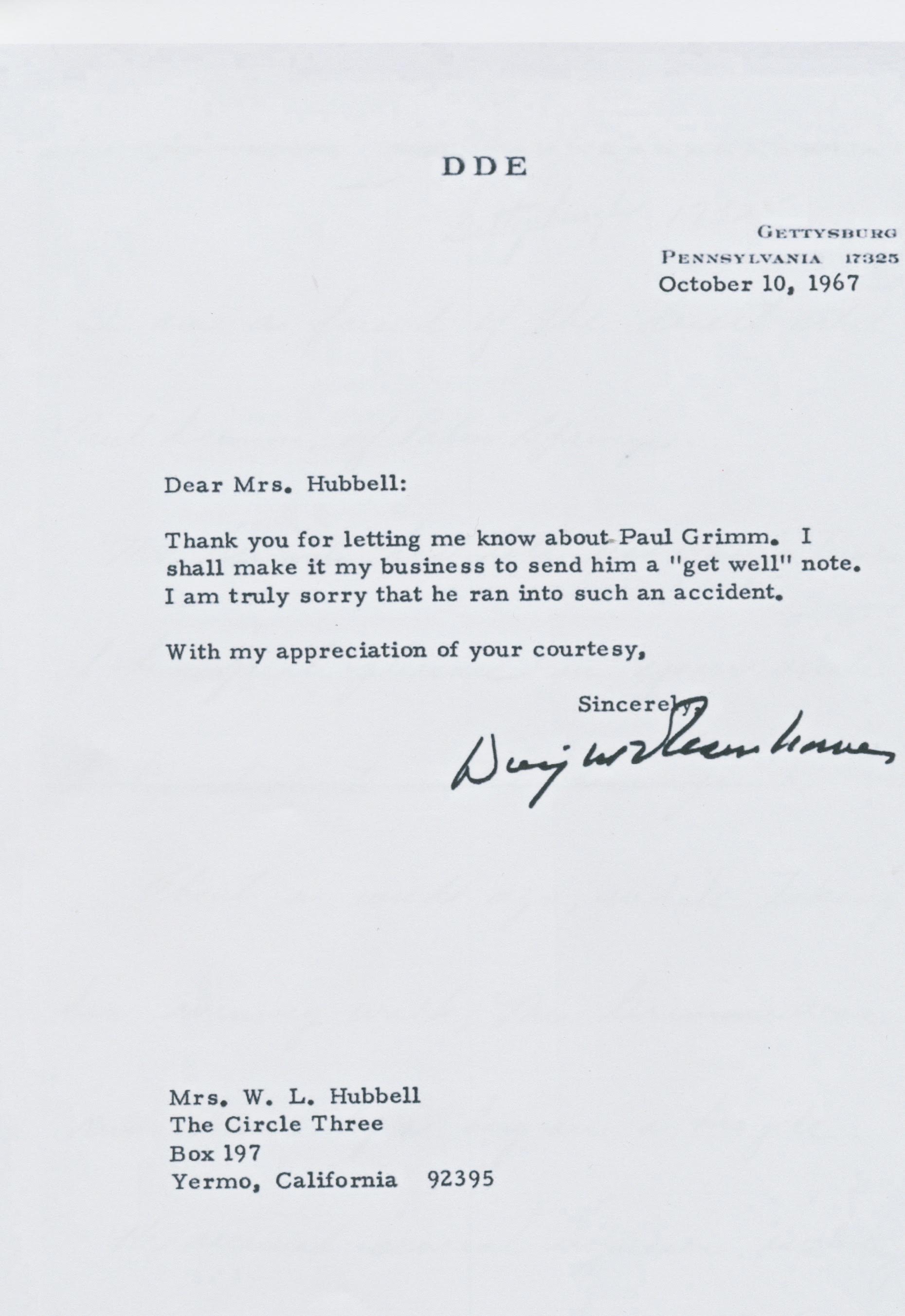 Over the years of their friendship, the Hubbells purchased a number of Grimm’s paintings and Grimm frequently shared his feelings on art and artists. He refers to a budding art student–Dwight Eisenhower–who visited the artist at his Palm Springs studio. Among the letters Ann unearthed is one from “DDE” (Dwight David Eisenhower), thanking Marie Hubbell for letting him know about serious injuries Grimm suffered when he was hit by a bicyclist in Palm Springs.