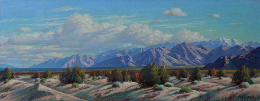 Grimm paintings hung over fireplaces in Minnesota and Nebraska, reminding the owners of holidays in a warmer place. He was known for his portraits of Cahuilla Indians (few painters tackled the subject), including shaman Pedro Chino and Chief Francisco Patencio. But most of his output was dunes and mountains. All the lofty terms apply: Grandeur, nobility, majesty. The terms are out-of-fashion in modernist-mad Palm Springs–but the qualities remain stubbornly embedded in the landscape.