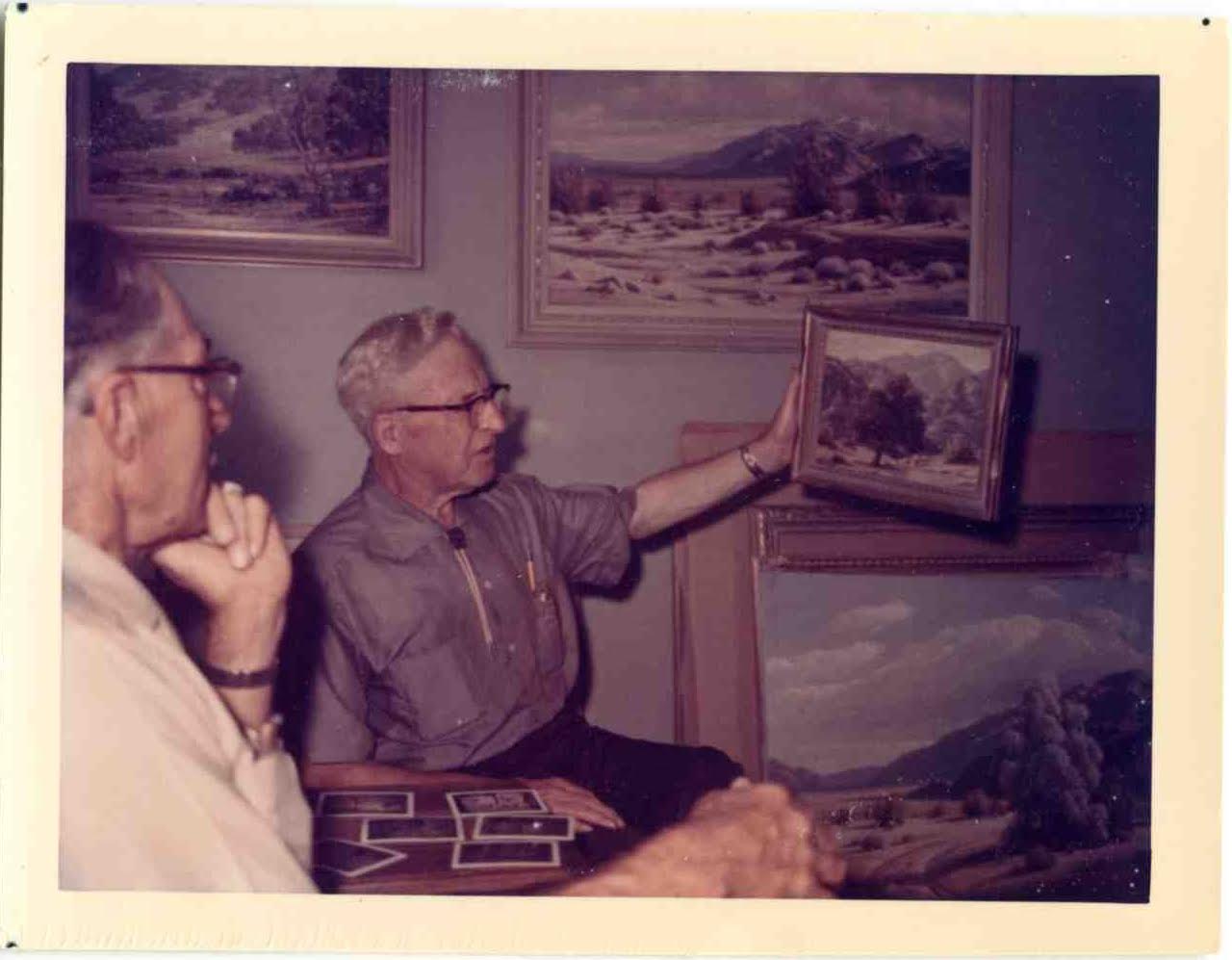 Ann Tompkins’ parents, Roy and Marie Hubbell, met the Grimms via their neighbor in the Temple City/El Monte area. The neighbor was Don Admiral, an early Palm Springs naturalist and founder of the original Palm Springs Desert Museum (now the Palm Springs Art Museum.) Roy Hubbell also liked to paint, but more than art what bonded him and Paul Grimm was their shared devotion to the game of cribbage.