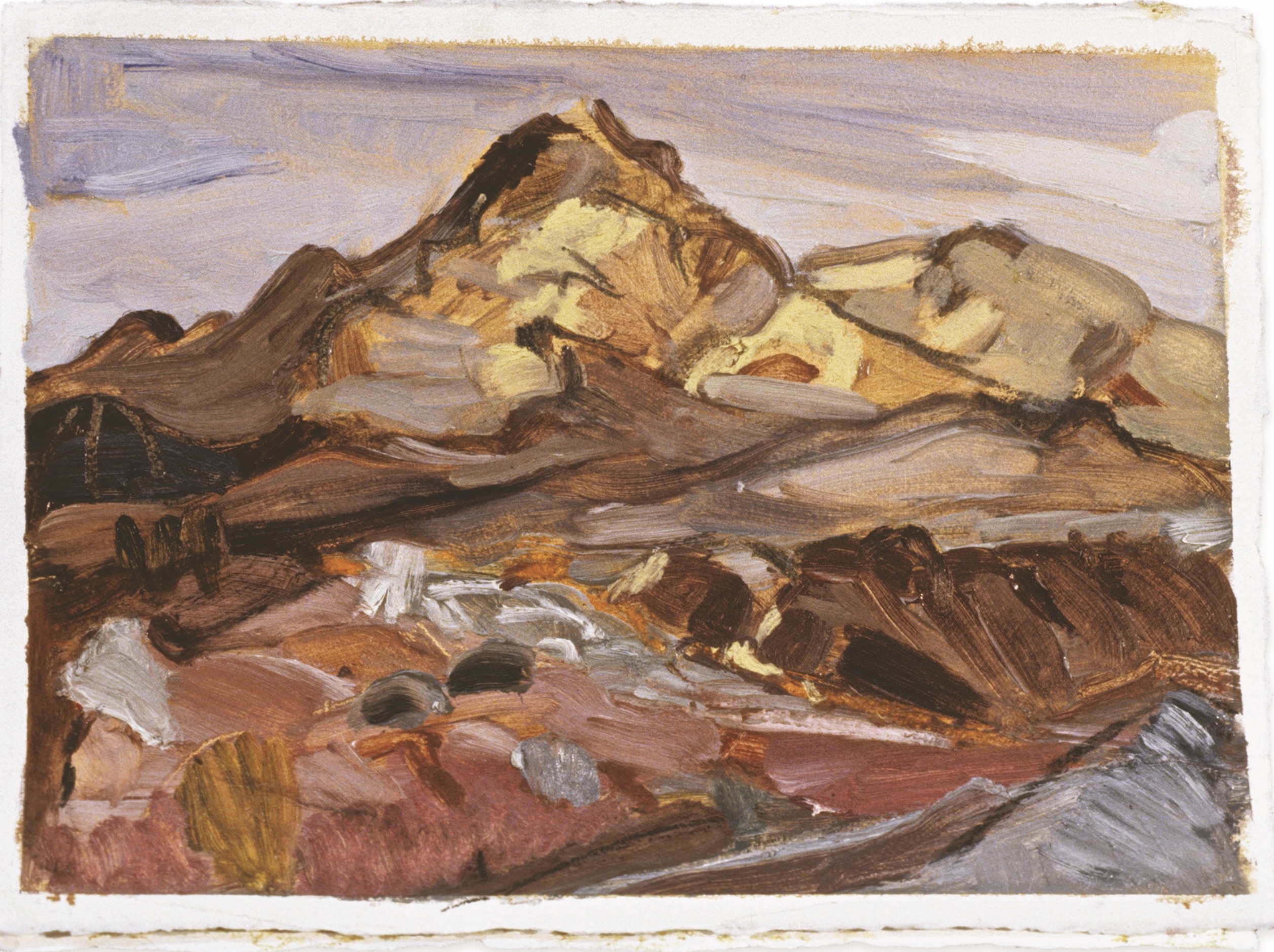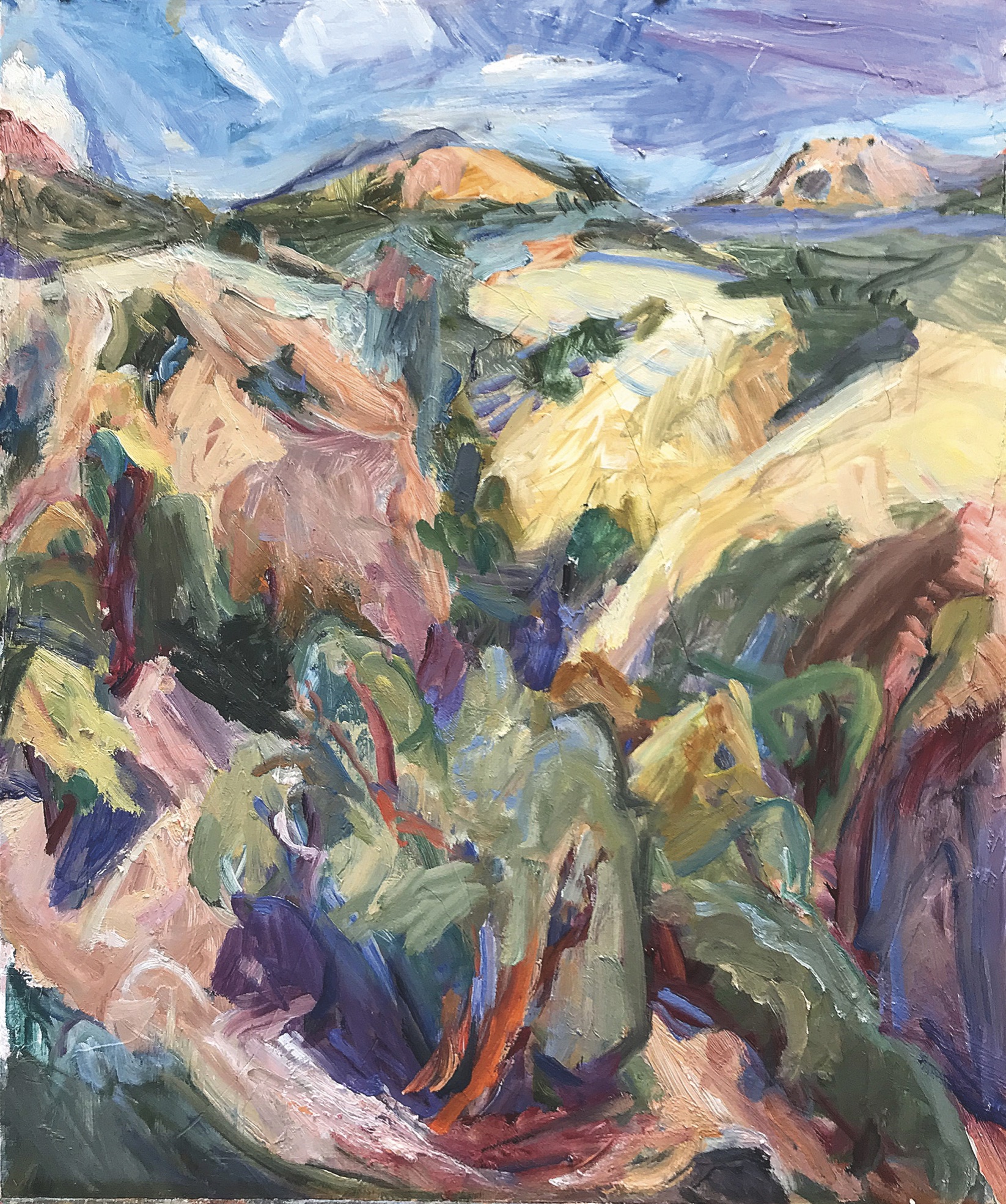 Anza: Dancing Hills From the Studio. Culp writes: “This very physical, visual history of the earth forming itself is reassuring. So also is the act of painting, which puts me in touch with a sense of a present kind of eternity.”