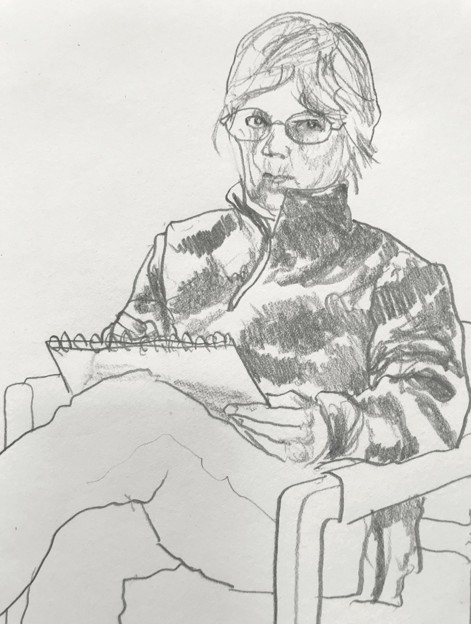 Drawing of Jane Culp by David Maxim. Culp writes: “Moving from New York to Anza, I feel as though I moved into my drawings. Holed up in this desert, I have become a hopeless anachronism within our dominant ‘weedy’ species. Here I have the rare opportunity to investigate the trumpet call of surrounding wildlands: its geological time clock viewed through the character of place.”