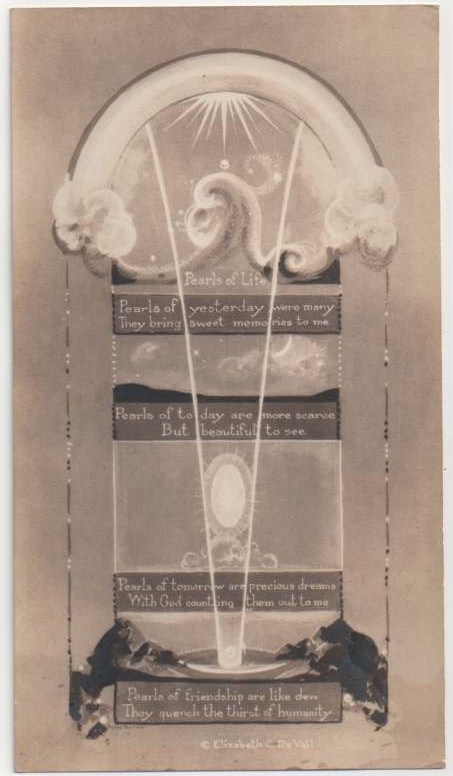 For you Agnes Pelton fans, here is a mystery to warm you up for the big Pelton weekend April 6th and 7th. Julie Verhagen of Denver (formerly of Palm Springs) owns a piece of rare Pelton ephemera. It appears to be a sepia-toned photo of a Pelton painting, 4-1/2″ x 8″, signed lower left, with a hand-painted deco border. Whether this card was made by Pelton herself, or made by someone else using a photo of her work is part of the mystery.