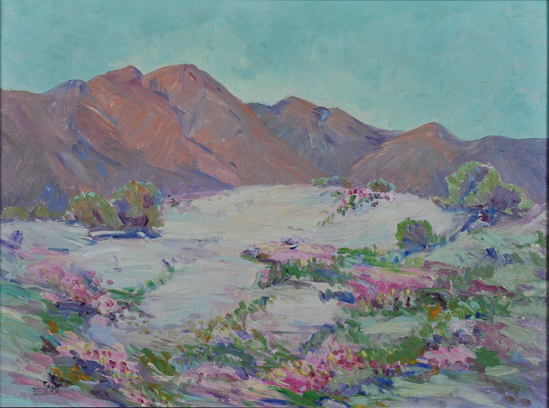 Few of the artists were desert residents, because there were few full-time residents of desert towns like Palm Springs in the early 1900s. Yet many of them made excursions to the deserts; desert scenes are sprinkled throughout the volumes like hidden prizes. Well-represented are women from San Diego–some involved with the Theosophy school at Point Loma–and many of this group, in particular, made treks to the desert.