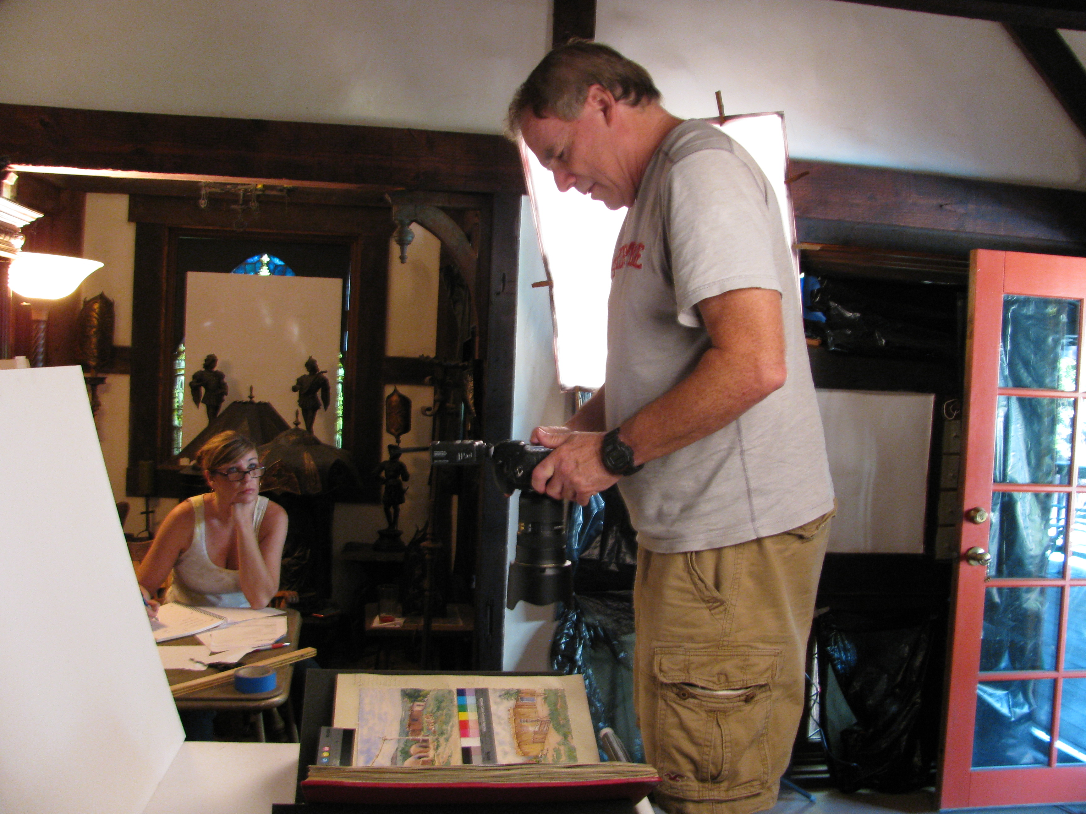 Martin Folb photographing work by Eva Feynes. Maurine’s daughter, Desiree, watches in the background.
