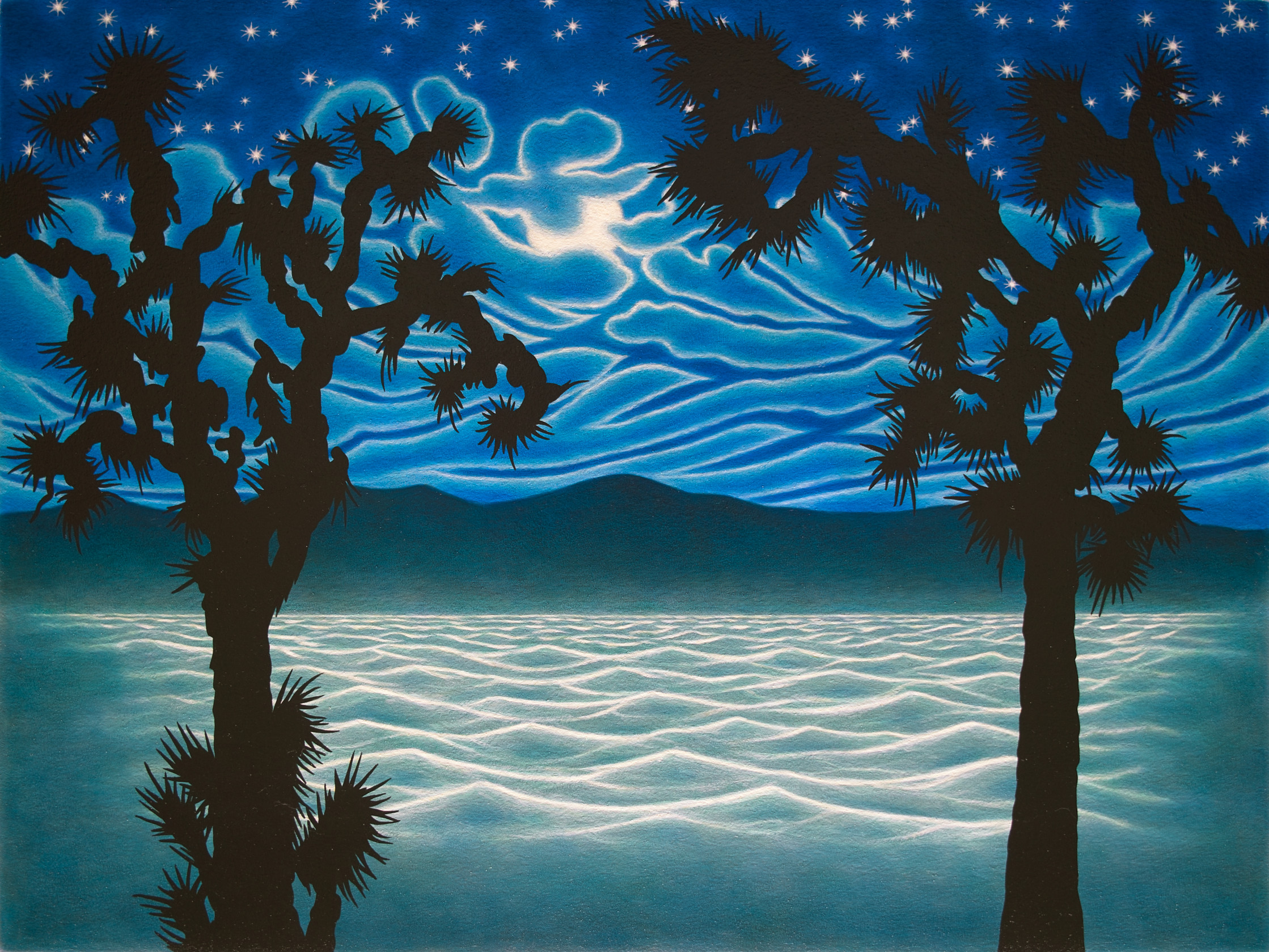 The moment propelled her into a career as an acclaimed contemporary landscape painter. She takes the elements of nature–stars, clouds, wind, Joshua trees–and makes them spin and hum. Ellis has appeared in a gallery show alongside her childhood hero, visionary watercolorist Charles Burchfield, as well as sharing wall space with Agnes Pelton and Georgia O’Keeffe. She has herself been compared to Pelton and Burchfield, as well as to the contemporary art world box office star Vija Celmins. “Sharon is a kind of in-house, ‘best kept secret,'” says University of New Mexico art history professor Libby Lumpkin. “Artists revere her.”