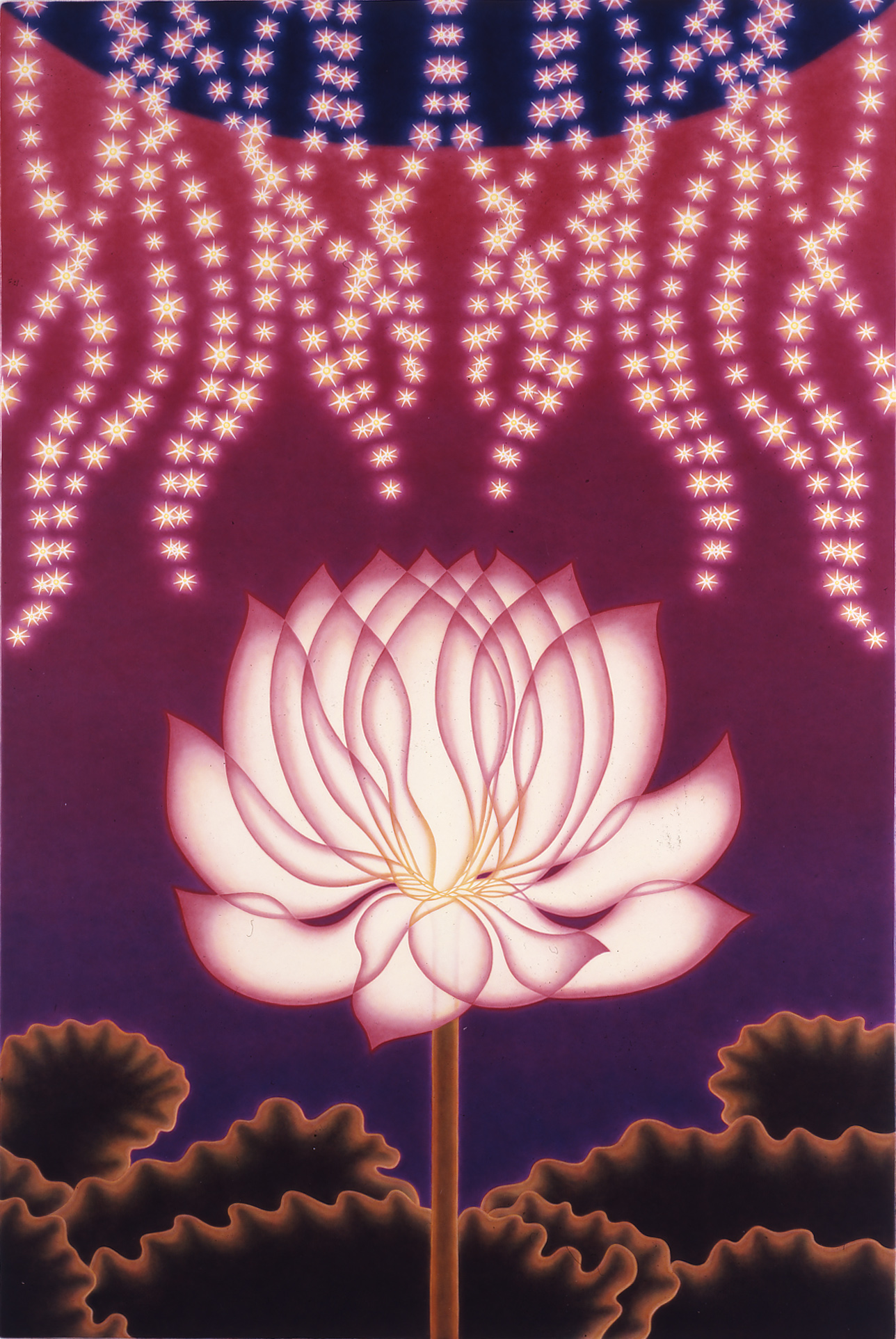 We’ve been visiting for awhile and I haven’t yet asked the artist how she can look at a tree and see an invisible world twined in the branches. As we’re sitting next to a painting featuring moonlit datura, a hallucinogenic plant—and because her paintings have been called psychedelic—it seems a good moment to broach the subject: Does her vision come from psychedelics? Is that the key? No, she says matter-of-factly, she only took LSD once and she was afraid of it. So, no epiphany via drugs.