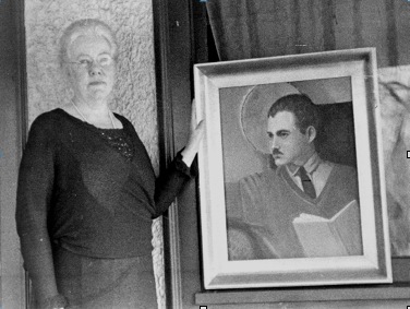 Grace Hall Hemingway with a painting she did of Ernest based on a Man Ray photo. Her choice of the almost saintly depiction of her son shows great pride in him and his accomplishments. Despite all the disparaging comments that Ernest later made about his mother, his choice of a painter as the occupation for the protagonist in one of his final novels may suggest his grudging admiration of her choice of painting for her late career.