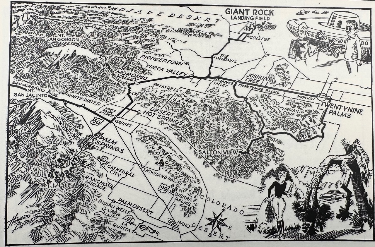 I’d stumbled upon Howard Burke’s desert maps while researching desert stories. Like Tom Davis I grew up in view of the San Gabriel Mountains and remember looking up toward snowline with longing before I could drive. The Happy Wanderers maps gave me the same hopeful feeling I’d known as a kid in Southern California, and so I decided to go looking for the story of the artist. It seemed, though, that one of the most important cartographers to shape the public view of Southern California had all but vanished from sight.
