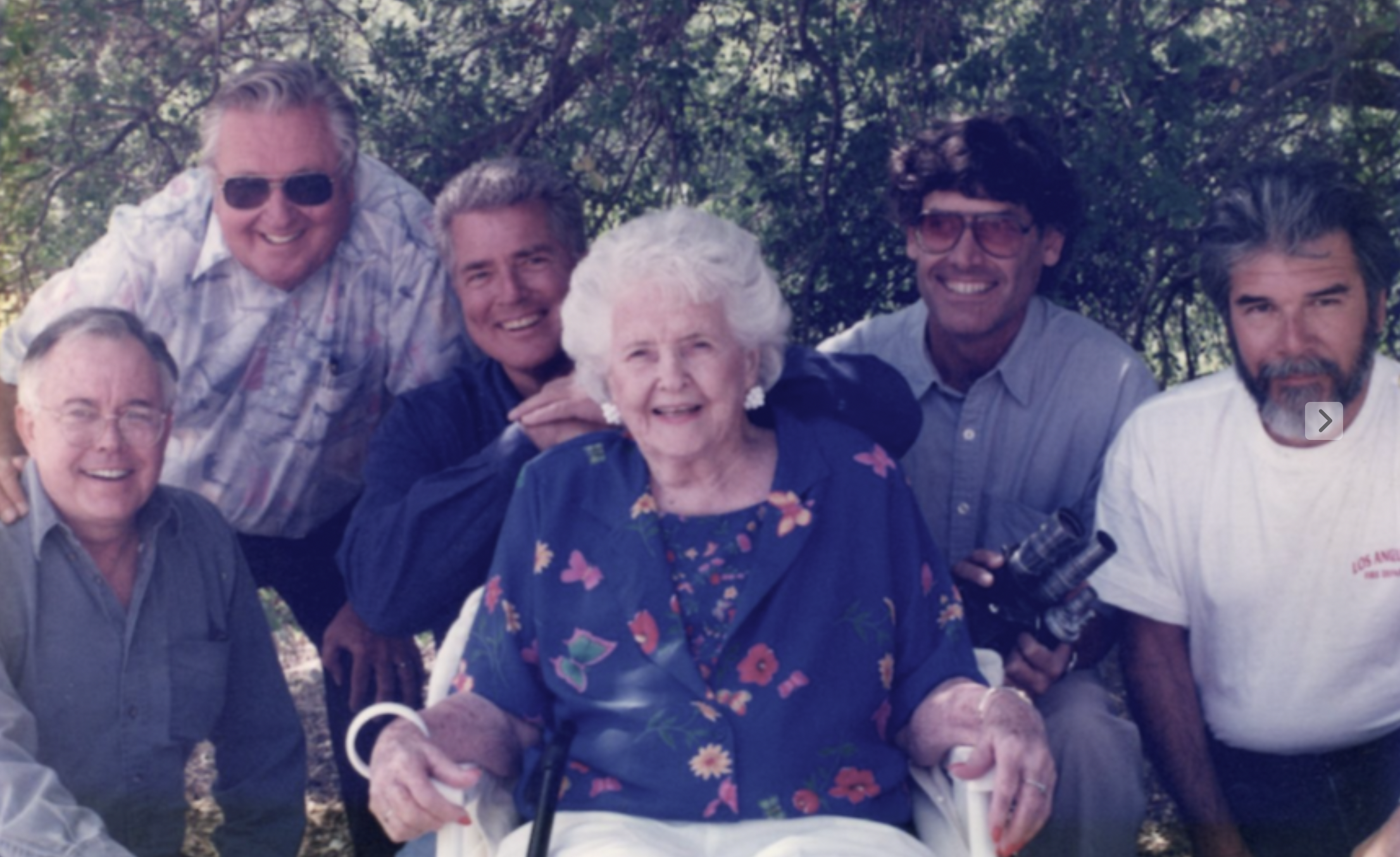 After Slim Barnard’s death, Huell Howser celebrated the TV show and the surviving cast members in a 1997 episode. From left, George Bowden, Larry Barnard, Huell Howser, Henrietta Barnard, Alan Coats and Luis Fuerte (Huell’s camera operator.)