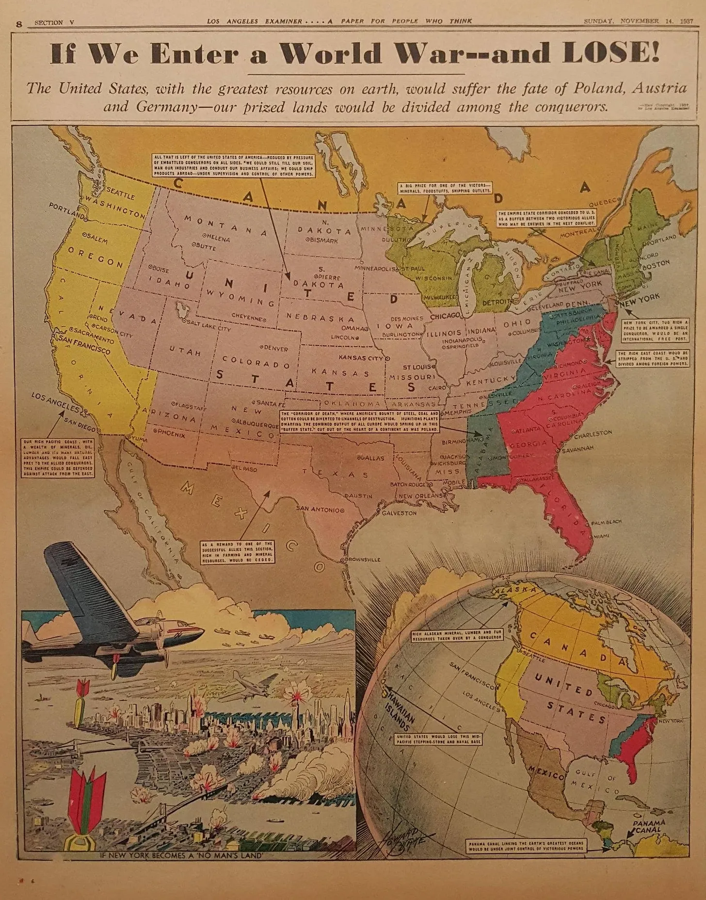 At one time, in the 1940s, Burke stood alongside Charles Hamilton Owens of the Los Angeles Times as Southern California’s two most influential pictorial mapmakers. For the Los Angeles Examiner, Burke published detailed World War II maps such as “How Japan Might Attack the United States” and “If We Enter a World War and Lose.” These early maps are still coveted by map enthusiasts decades later.