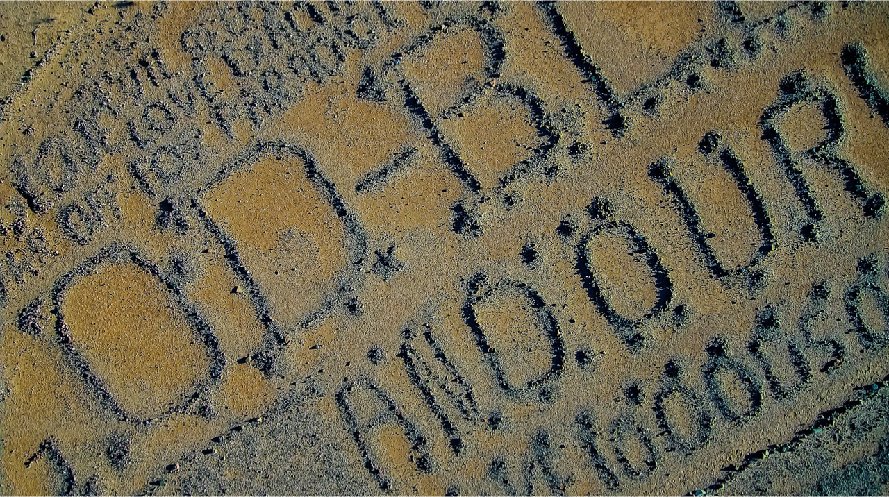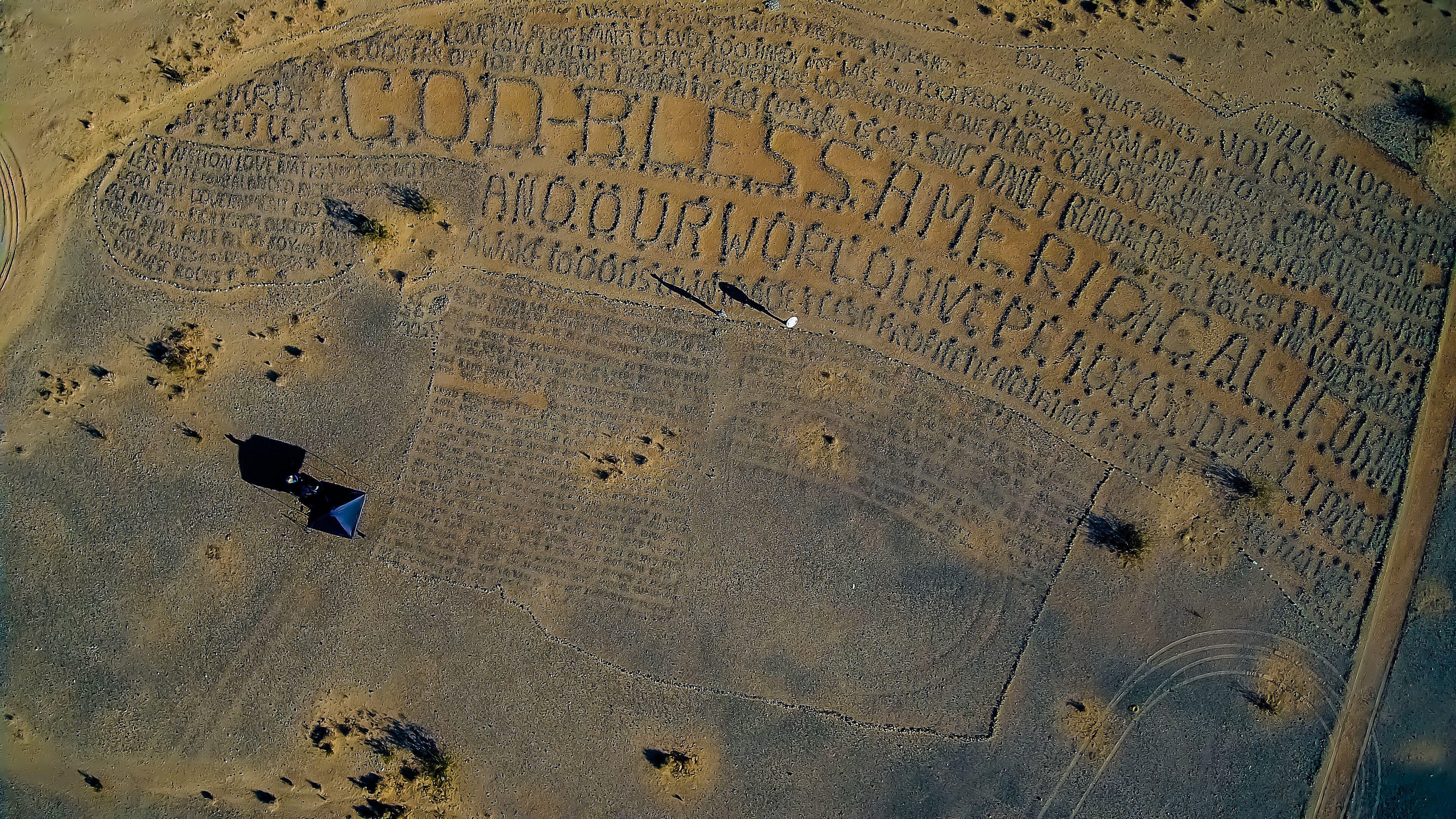 Ken Sitz–the man who discovered the work via Google Earth–observed that Hazel’s work resembles a giant Dr. Bronner’s bottle. Beneath the large letters are what appears to be smaller text, but the words are unreadable, perhaps erased by wind or floods. Sitz, who calls the creation Volcanic Gardens, speculates there may even be a secret code embedded in the small dots.
