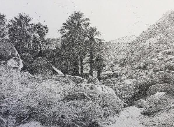 Well-known desert painter and instructor Mark Kerckhoff has embarked on a series of pen-and-ink drawings. While he’s best known for powerful color and brush work, the drawings are orderly and somehow restful. Asked to comment on this new path, he said: “I’ve always loved drawing but in all my career, have never taken the time to just do a drawing. Scratching something onto the canvas, yes, but never just drawing for drawing’s sake. So here I am. My wife tells me to keep the paintings going, but I never listen.”