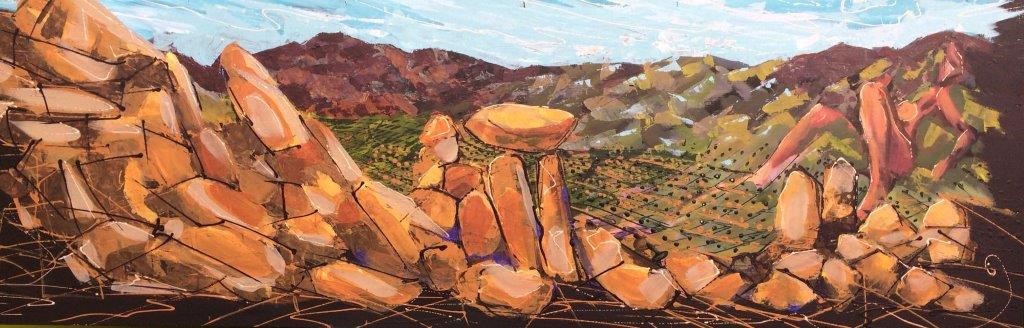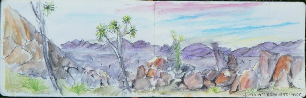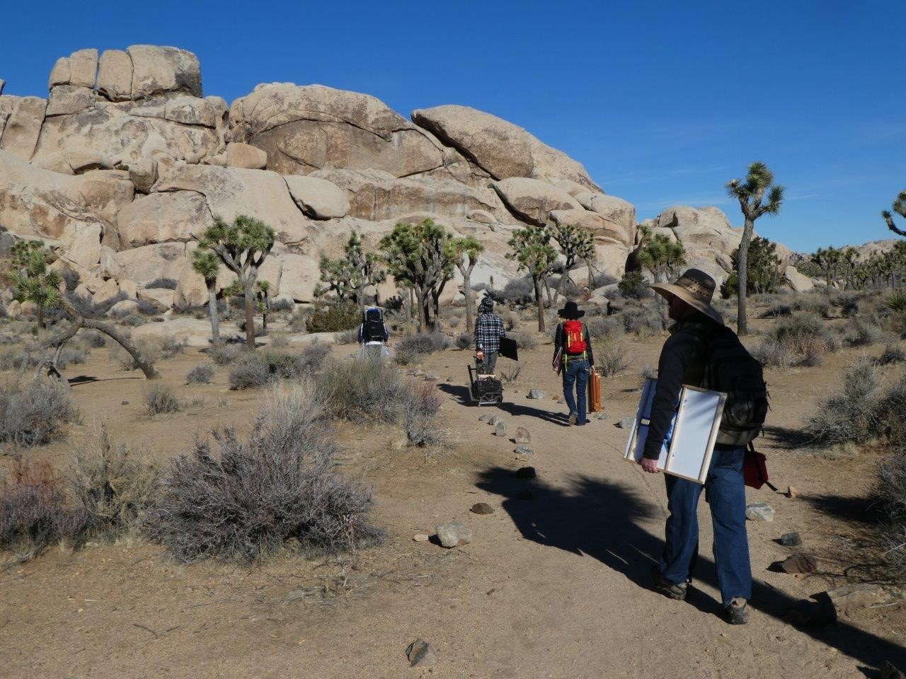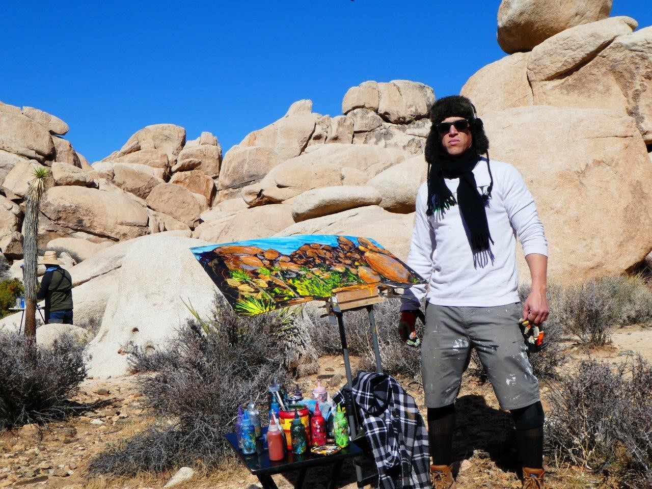 In February 2018, the Magnificent Six+ returned to Joshua Tree National Park for yet another desert paint out. Jim Trolinger, Pauline Abbott, Zeke Guspan, Geoffrey Winnie, Steven Seizo Nakamura, and Jesse Fortune are the original Magnificent Six and the plus comprises artist friends who join in various outings; this paint out included also Marissa Head, Ruth Geller, and Robin Theron.