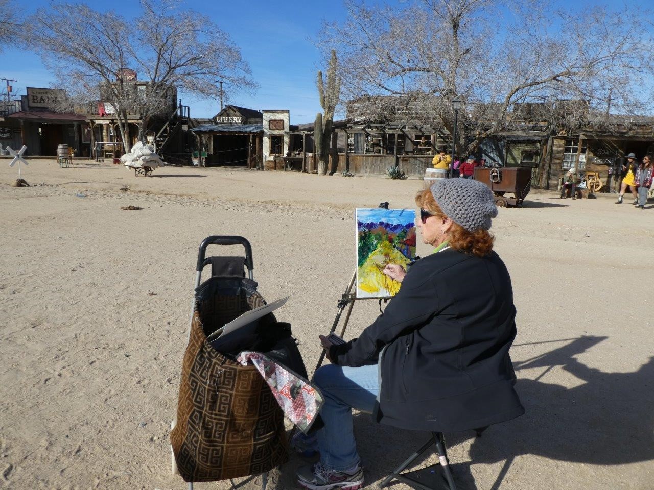 We made our first planned painting stop at Pioneertown, a small diversion, just north of the town of Joshua Tree. Pioneertown offered a pleasant surprise, bustling with tourists and a street of 19th century structures, widely used by the movie industry for westerns. During our stay we witnessed music, dancing, and gunfights in the street. One thing became obvious, however. With temperatures hovering in the forties and strong winds making it seem much colder, this was going to require more clothing than we had originally thought.