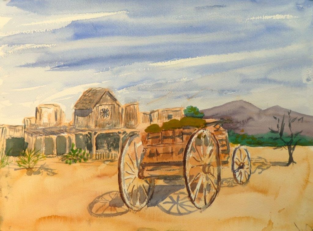 My scene of choice was a wagon, loaded with hay with an interesting background of old buildings, and I spent most of the stay working on this water color. Western music and dancing provided an interesting accompaniment and I took breaks to witness and sketch a few gun fights over the next three hours.