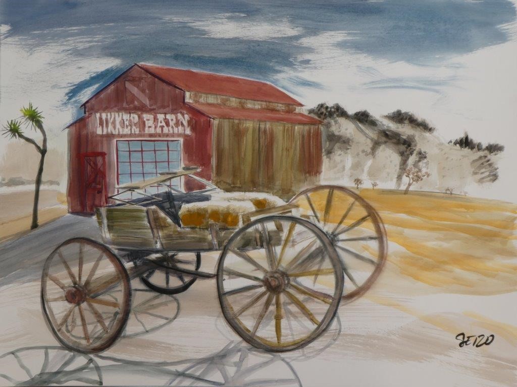 Steve painted the same wagon from the opposite side, which provided a background including the “Likker Barn”. He also produced a water color of two locals.