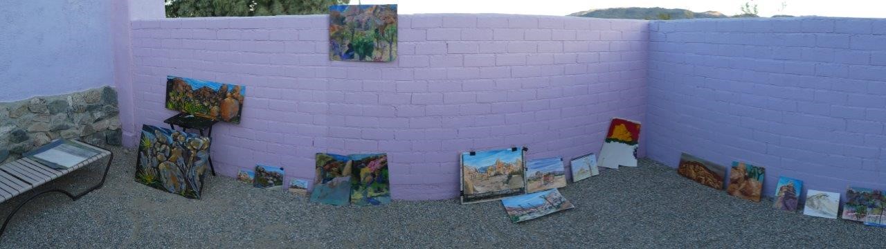 In the afternoon, after conferring with other artists, Robin demonstrated finding a sweet spot out of the wind by sitting close to a large rock or bush on the leeward side. Using Robin’s trick, I found a spot in the sunshine, sheltered by a large bolder out of the wind, found it oh so much more comfortable painting and moved into the zone for hours, interrupted only by an occasional tourist who wanted me to know about his grandson who paints. After another four hours, we packed our gear, returned to the hotel, and prepared for our traditional critique. My Buffalo Burr cabin has a nice patio area. We placed paintings from both days along the wall and went one by one, discussing the various choices, problems, and potential fixes for the paintings.