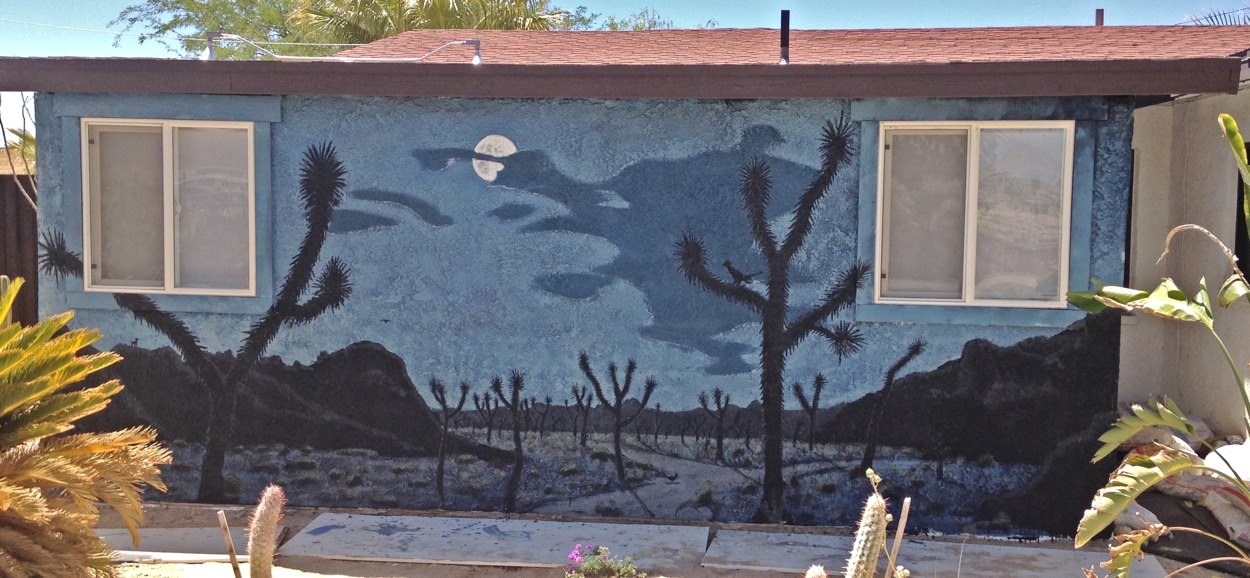 High desert artist David Greene, formerly featured here, continues to explore the desert at night. His latest effort is a mural for a friend’s house in Wonder Valley and a series of new noirs, including the soulful Sparky and the Cabin of Forgotten Dreams.