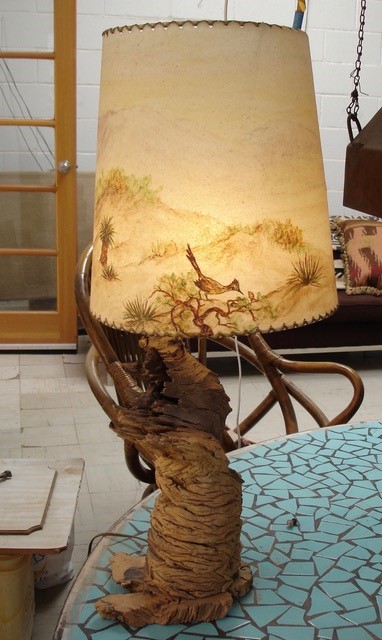 While restoring the John Hilton house in 29 Palms, Jamie Caffrey has been frequenting thrift stores up and down Highway 62. One primo find was an old lampshade painted with a desert scene. The lamp turned out to be the work of Roy and Margaret Jewett, who operated the Desert Lampmaker shop on a dirt road outside Yucca Valley in the 1950s. Roy made the lampstands out of local wood and Margaret painted the shades.