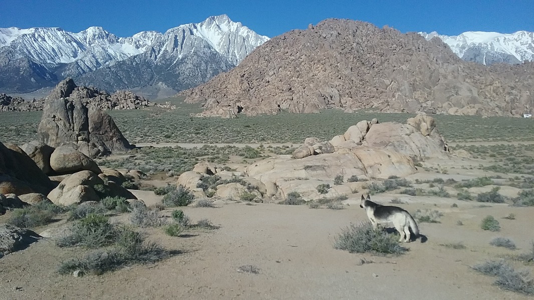 Filmmaker Ermanno Vanino read our recent article on migratory painter Jim Toenjes and tracked down Jim for his web TV series Desert Dwellers. In the film Jim wanders around the Alabama Hills near Lone Pine, dispensing thoughts on color, while his faithful desert shepherd, Greta, scouts the vistas ahead.