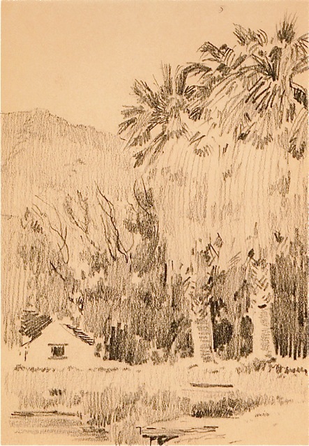 Eager to view more of California’s diverse scenery, Jack, with sketchbook in hand, visited San Diego County, spending a few days in Coronado. In March, after going back to Redlands, he went to Santa Barbara, followed by a return to San Diego County, this time making stops at Alpine and La Jolla. By the end of March, he had settled in Palm Springs, renting a bungalow at the famous Desert Inn, owned by Nellie Norton Coffman. Also staying at the inn was his ailing friend from New York, Warner Leeds, who was with his wife, Louise.