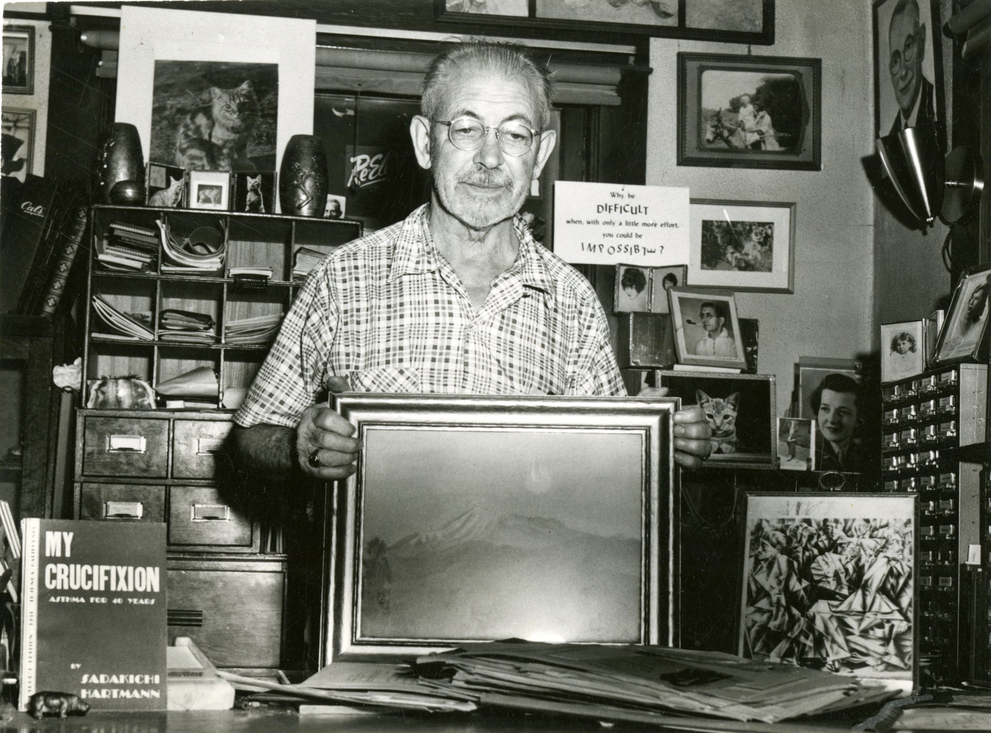 UCR Special Collections has a photograph of Guy Bogart taken in his study, surrounded by numerous photographs of family and cat memorabilia. He is holding a painting by Sadakichi of Mt. San Jacinto. Other Sadakichi related items in the photograph are the cover of Sadakichi’s book, My Crucifixion, Asthma for 40 Years, and a small print of the famous Ben Berlin painting, Opus to Sadakichi, I934.