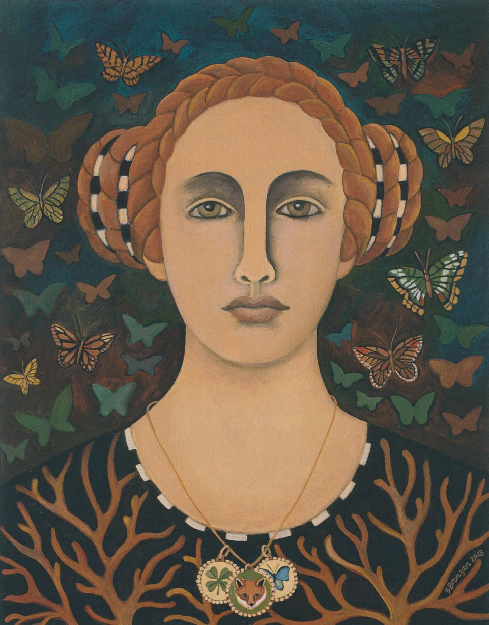 Believer. “The woman is wearing a shirt patterned with coral branches. She is surrounded by butterflies. Around her neck are three lucky amulets, a fox, a butterfly, and a four leaf clover. Each of the amulets have magical meaning.