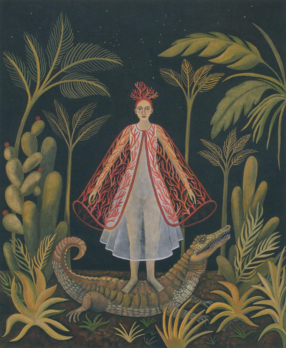 Body Guard. Descriptions with each painting are by the artist. “The woman is standing on an alligator. She is vulnerable…no armor. She is barefoot. She is wearing a translucent dress, however she is also wearing a coral cape (coral is protective) and a coral headdress. A question posed by the title: Is the alligator or the cape the body guard?”