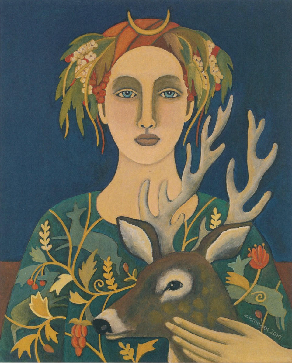 Bravehart. “The title is another play on words.The hart is a deer. The painting is based on the myth of Diana the Huntress. I imagine each one (Diana and the deer) giving strength and refuge to the other.”
