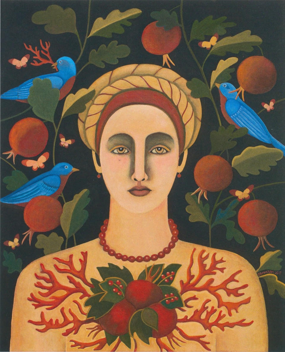Breastplate. “The breastplate was designed for protection. In this painting the breastplate is made of coral and pomegranates. Coral is believed to bring the wearer protection and longevity. Pomegranates are symbols of fertility and prosperity.There are bluebirds of happiness in the background.”