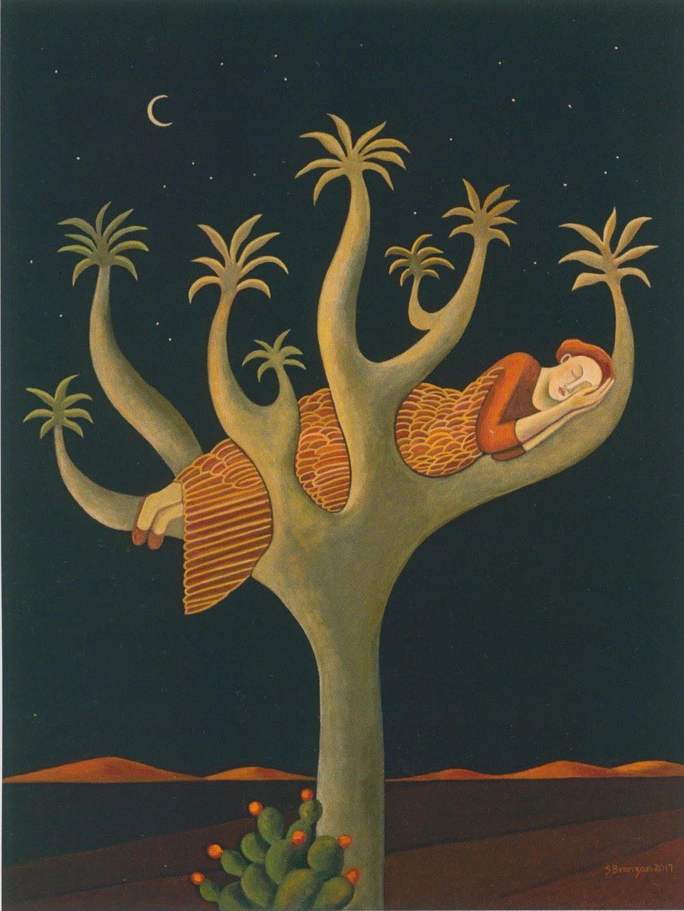 Dreamer. “The figure fits comfortably in the nest of the Joshua Tree…no worries, sleeping soundly. This reflects the stillness and peace I find in the desert.”
