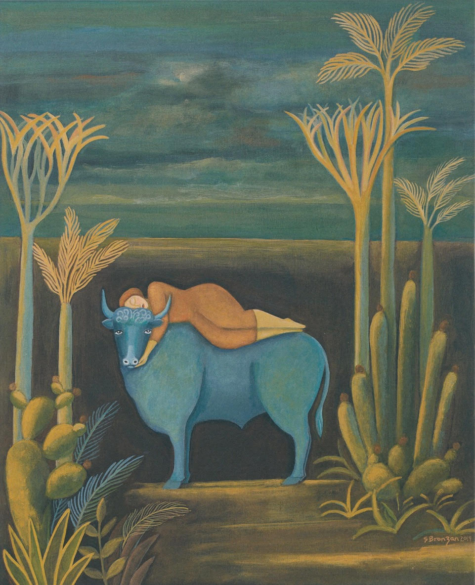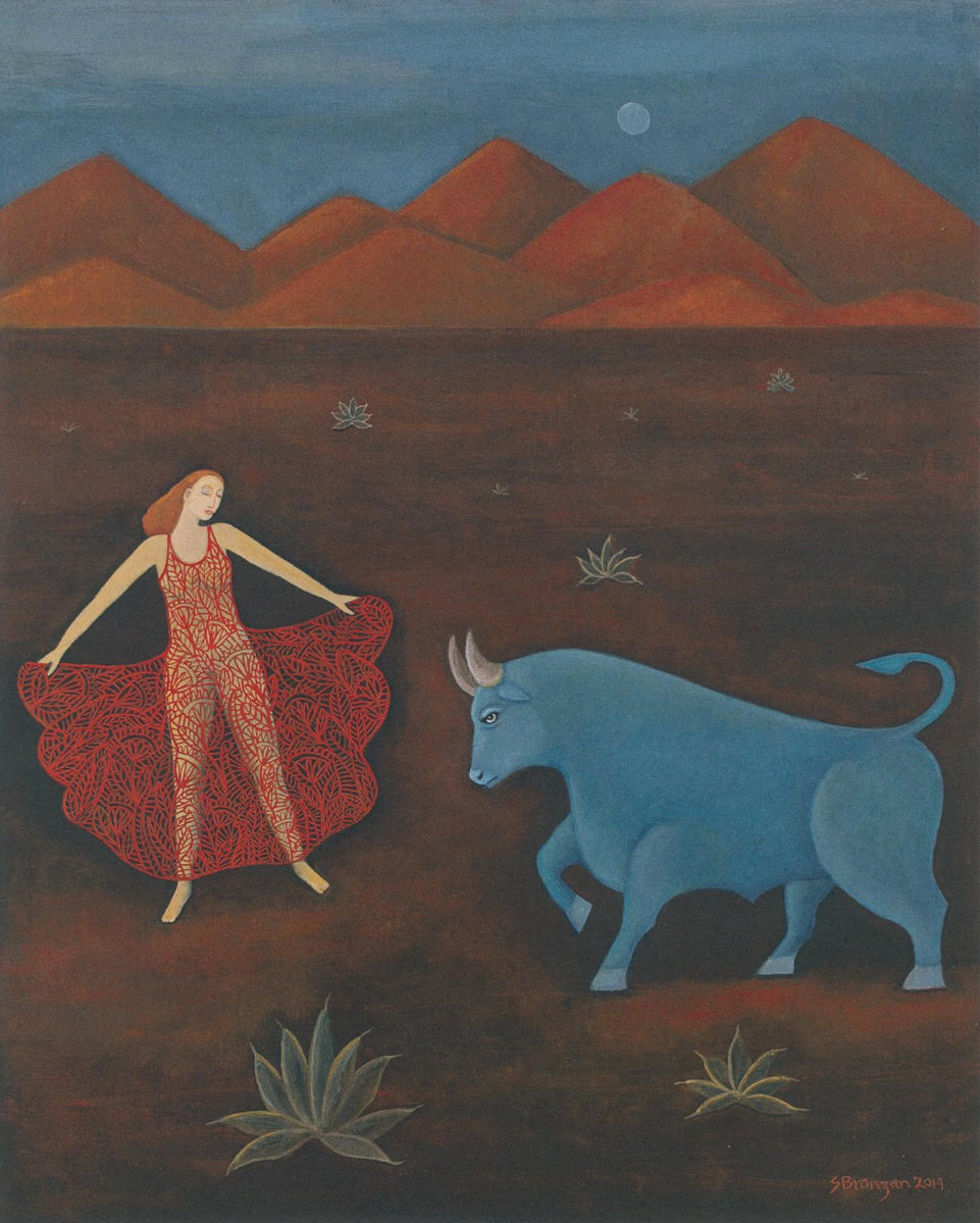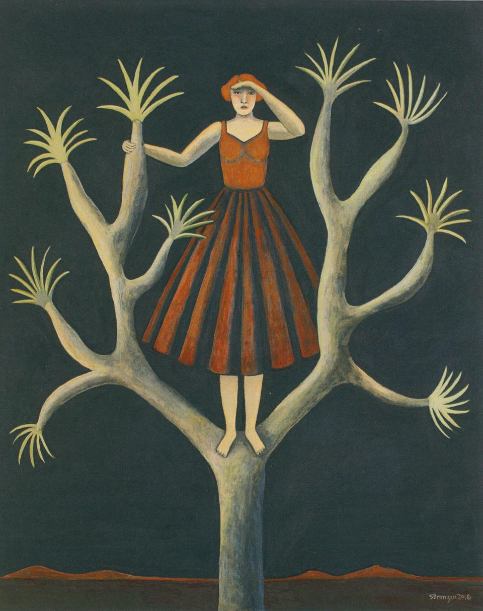 In a classic Sharon Bronzan painting you find a woman alone in a wilderness booby-trapped with daggered cactuses. She doesn’t look away but stares unflinchingly into danger. When she relaxes her hold on strict logic, her life-saving guardians appear: a lion, an alligator, a Joshua tree.