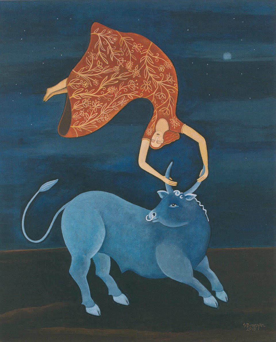 The landscapes are also neutral. In the painting of a woman flying in the air with a bull (Toro Tango), there’s a stillness in that. She has her eyes closed. The stillness just kind of makes the world stop and everything is quiet–and I think probably safe, as well.