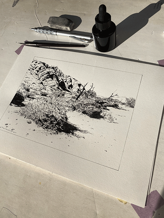 Warner Graves, grandson of early Mecca photographer Lula Mae Graves, continues to follow in his grandmother’s desert immersion tradition. The Cathedral City resident has been intensively painting the local canyons, as well plenty of ferocactus, catsclaw and cholla. “I’m mad for cacti,” he says. See the results of his study at the 29 Palms Art Gallery through April 25, 2021. He shares the stage with Khyrysso Heart LeFey, whose patterned work is inspired by quilting.