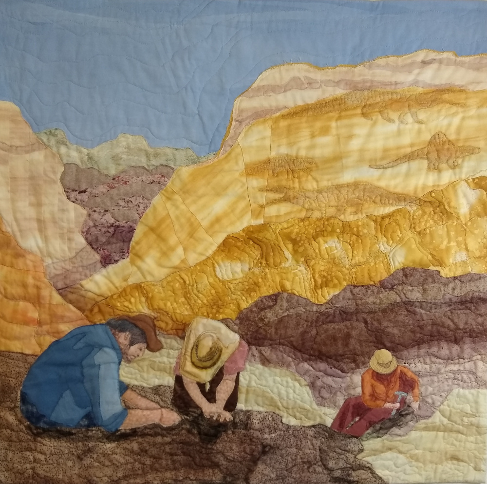 Fiber art may be the perfect medium to capture desert time and rock, judging by the work of Martha Turner and also Catherine Clark. A resident of the White Mountains in Arizona, Clark has served as artist-in-residence at Montezuma Castle and has an upcoming residency in September, 2021, at the Painted Desert/Petrified Forest National Park. She studied geology and taught 9th grade science, a background that helps her “take the long view” of life and art. In her piece, Triassic Timewall, “shadowy creatures formed in a time when the earth was younger march across the face of a cliff above modern-day scientists carefully examining fragmented fossils of their bones.”