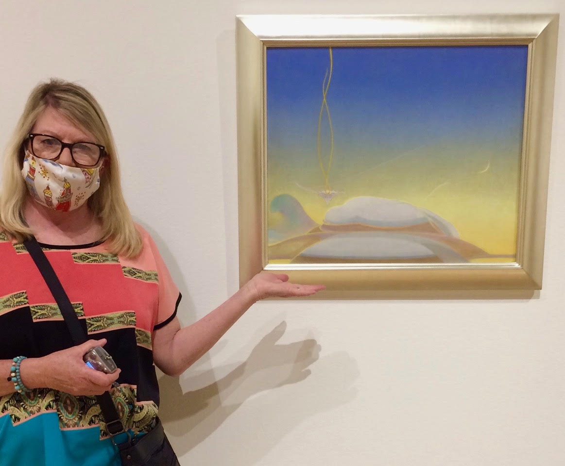 “What a journey this beautiful painting has taken. It came into my possession back in 2011 after the passing of my cousin, Mario Acord. The executor of his estate told our family if we wanted what was left of his possessions we’d have to come to Tucson and pick them up, otherwise everything was going to the Goodwill. Rick and I headed to Tucson to bring home whatever was left to divide up with the Acord family. Among the things was this painting by Agnes Pelton, Translation, 1931. I had seen it hanging on Mario’s wall during visits and always loved it, but unfortunately never asked him about it or where he got it. No one else wanted it so I was more than happy to take possession of this interesting piece of art. I had no idea who the artist was, I just loved the colors and the calming way it made me feel.”